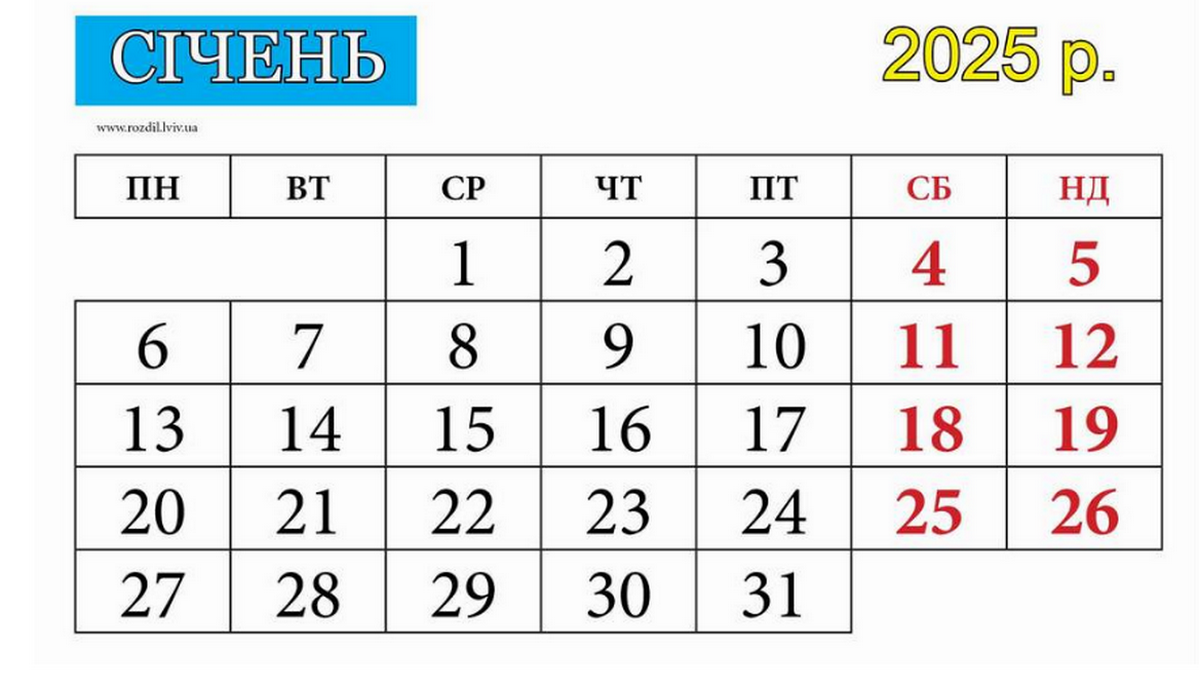 У січні українці відпочиватимуть лише по суботах та неділях, адже додаткових вихідних під час воєнного стану не надають, навіть якщо святковий день збігається із суботою чи неділею. Вихідні січня 2025 року – 4, 5, 11, 12, 18, 19, 25 і 26 числа. Про це повідомляє Інформатор.