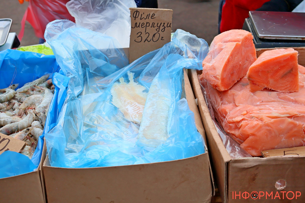Цього тижня біля рибної продукції людей було небагато, активно купували хек по 155-165 гривень за кіло. З’явилось філе мерлузи по 320 гривень за кіло, а філе сома можна було придбати по 160 гривень за кіло. Цього разу були креветки лише по 400 гривень за кіло. Інше коштує так: