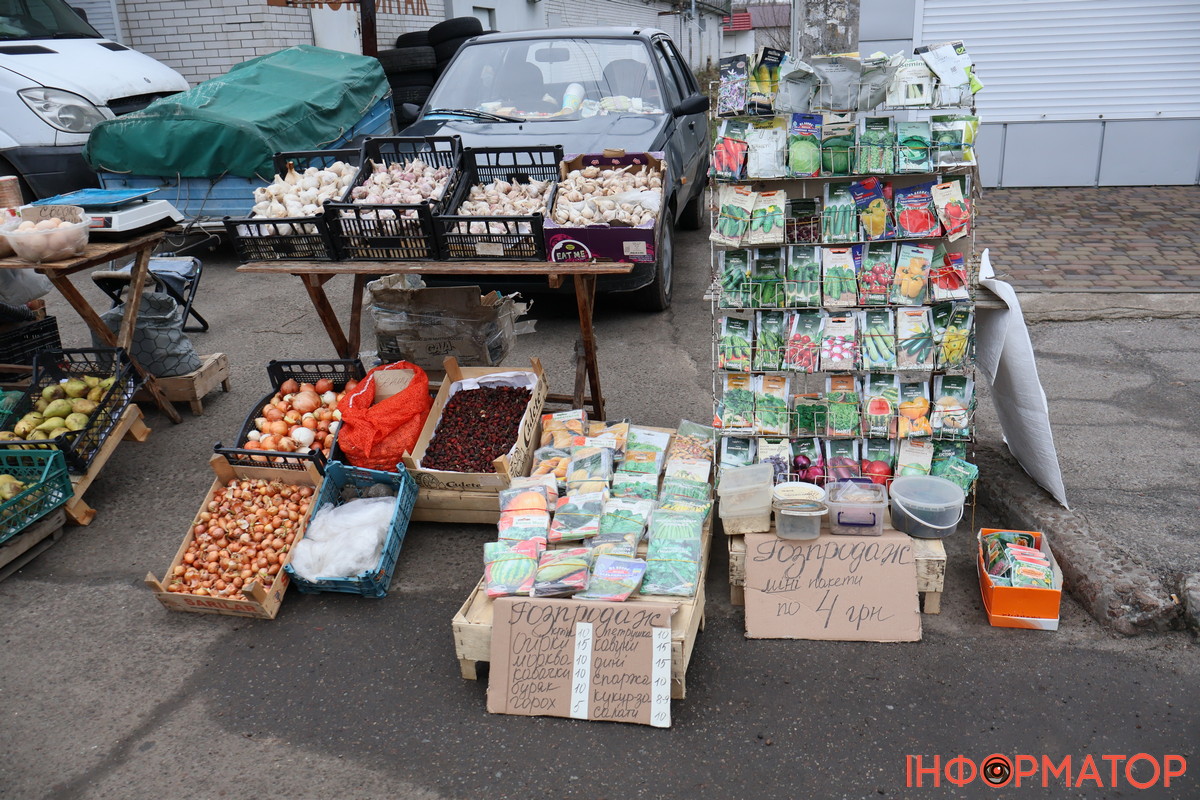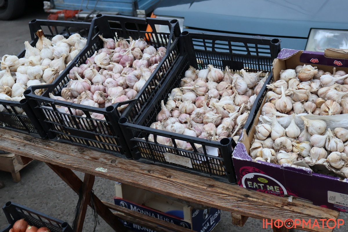 Поруч з місцевим супермаркетом чоловік продавав часник, ціни коливаються від 190-250 гривень за кіло. Також у нього можна було придбати цибулю на зелень, вона коштує 100 гривень за кіло. Інше коштує так: