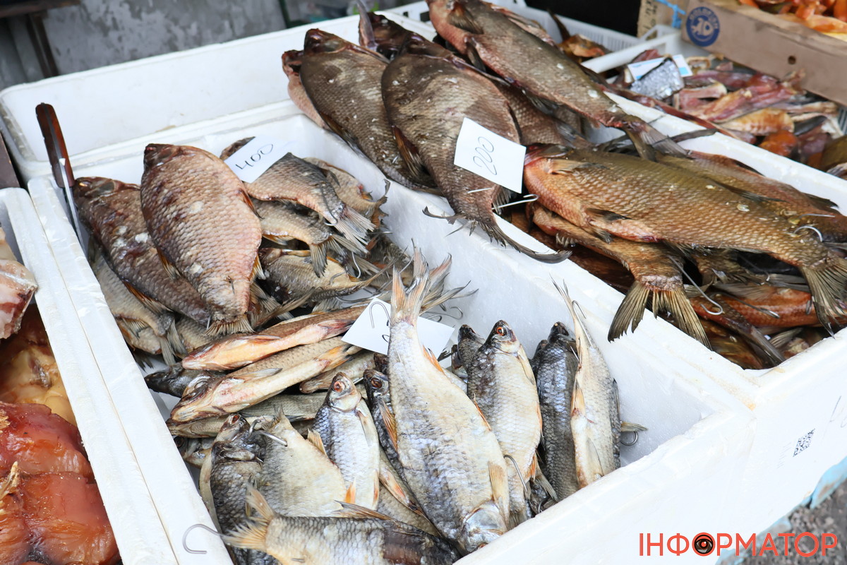 На прилавках з рибною продукцією товару було вдосталь. Можна було придбати стейк коропа по 250 гривень за кіло. Велика рибина товстолоба коштує 90 гривень за кіло, а копчений – по 400 гривень за кіло, його голову віддавали по 25 гривень за кіло. З малої риби продавали карасів – чищені по 70 гривень за кіло, а звичайні – 60 гривень за кіло. Інше коштує так: