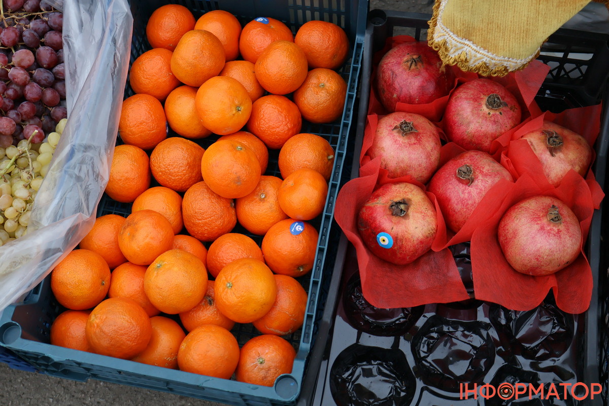 На прилавках з фруктами можна було придбати домашні груши по 65 гривень за кіло. Також пропонували гранати по 75 гривень за кіло, а ціни на мандарини коливаються від 70 до 85 гривень за кіло. Біля фургончику з оптовими продуктами продавали виноград без кісточки по 320 гривень за кіло. Ціни на інші фрукти зараз такі: