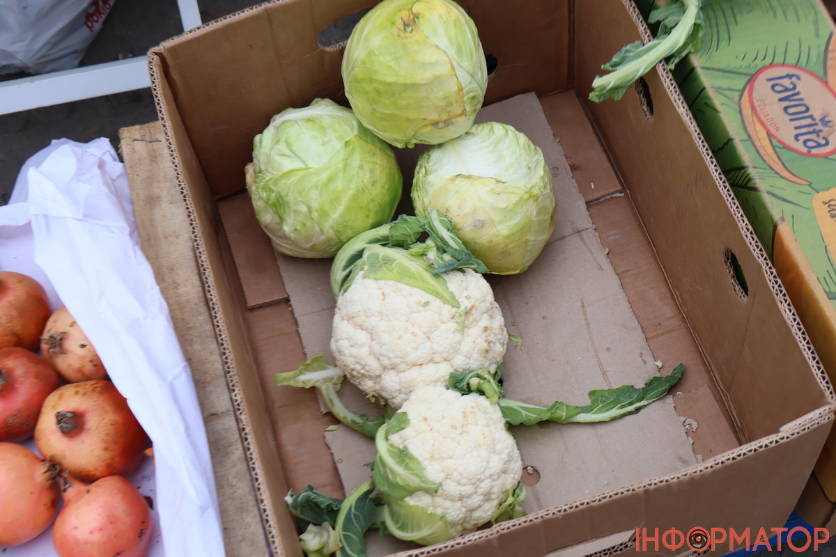 Всі овочі ховали під плівку або покривала. Продавчиня поруч з майданчиком біля ліцею продавала молоду капусту по 100 гривень за кіло. Цибуля та буряк йдуть в одну ціну – по 20-30 гривень за кіло. Також можна було придбати гарбуз, порізаний кубиками – 20 гривень за кіло. Інше коштує так: