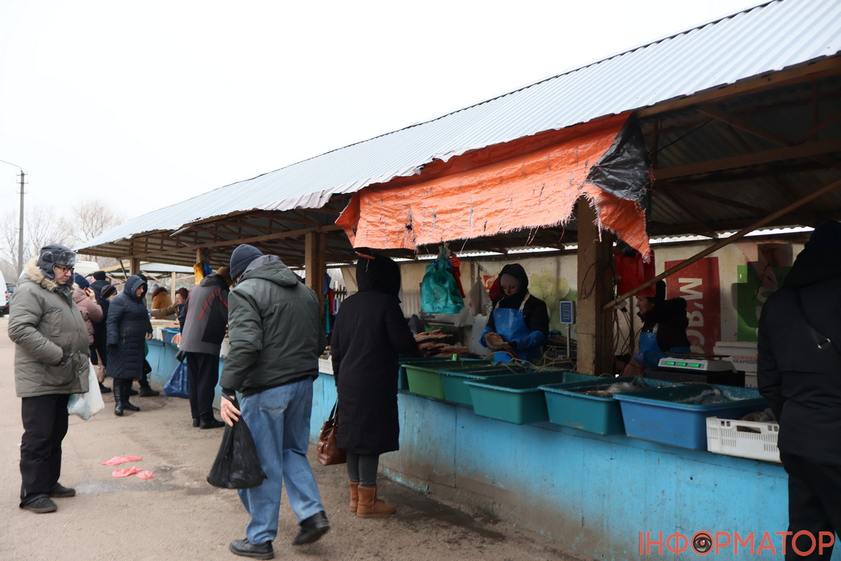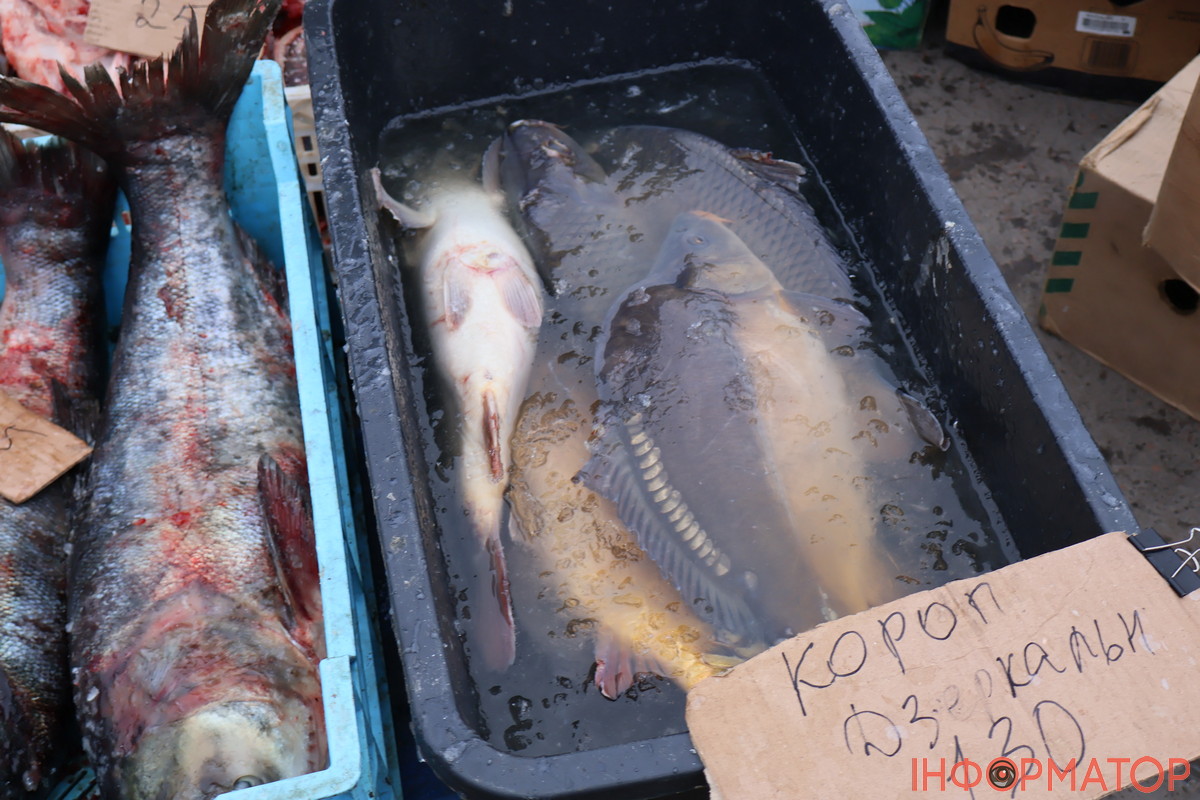 Поруч з місцевим ліцеєм чоловік продавав велику рибу – дзеркальний короп коштує 130 гривень за кіло, а щука – 110 гривень за кіло. Також на рядах з рибною продукцією з’явились морожені оселедці, їх віддавали по 150 гривень за кіло. Поки що ціни майже не змінилися: