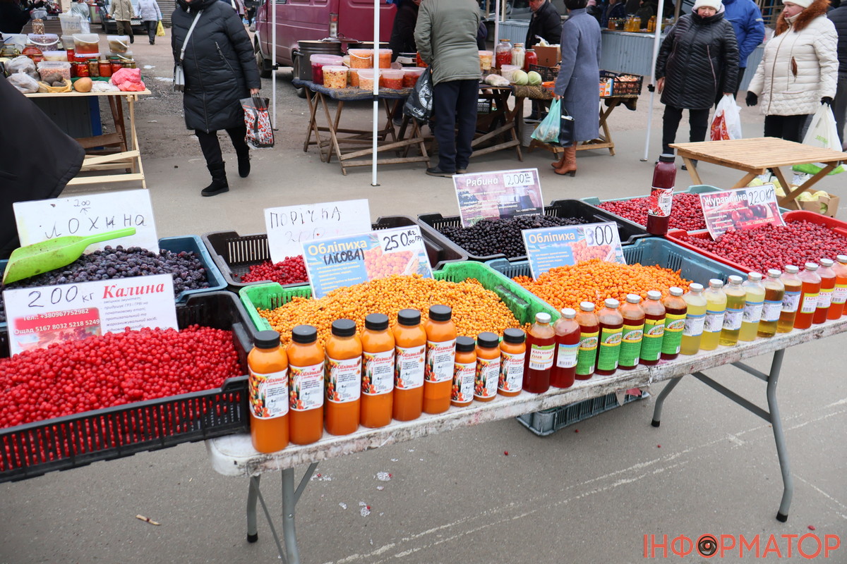 Більшість продавців фруктів через морозну погоду не вийшли на торги. Біля фургончику з оптовими продуктами зібралися великі черги, найбільше купували яблука – по 27-40 гривень за кіло. Домашніх фруктів зовсім мало, а от ягід навезли чимало. Журавлину та порічку продавали по 200 гривень за кіло, ціни на обліпиху коливаються від 250 до 300 гривень. Також можна було придбати натуральні олії. Ціни на інші фрукти та ягоди зараз такі: