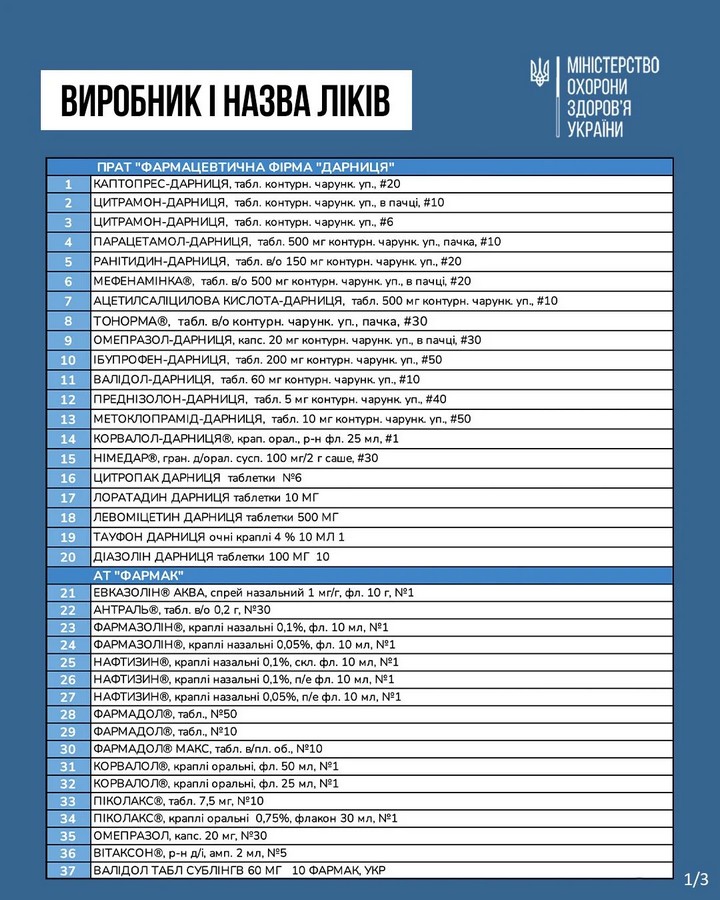 До 100 популярних ліків, тобто тих, які, за аналітичними даними, найчастіше купують українці, увійшли 20 позицій, які виробляє фармацевтична компанія “Дарниця”, 17 позицій – “Фармак”, 22 позиції – “Київський вітамінний завод”, 5 позицій – “Кусум Фарм”, 6 позицій – “Юрія-Фарм”, 8 позицій – корпорація “Артеріум”, 2 позиції – фармацевтична фабрика “Віола”, 3 позиції – Борщагівський хіміко-фармацевтичний завод та 10 позицій – “ІнтерХім”.