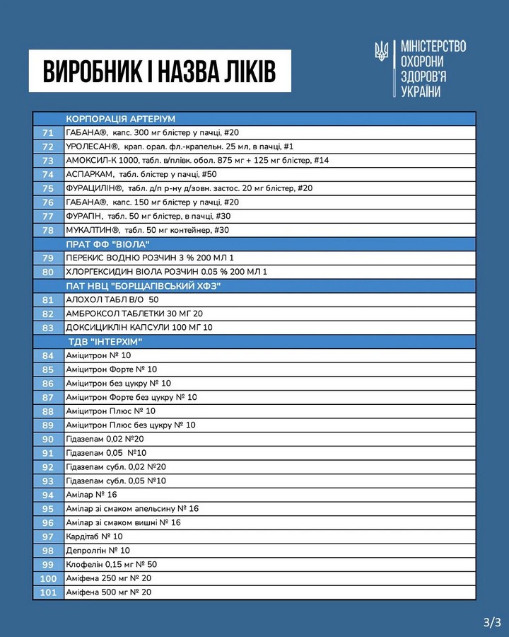 Зокрема у списку є ліки, які застосовують при кашлі та застудних захворюваннях, антигістамінні, протизапальні та протиревматичні препарати, вітаміни та мікроелементи, ліки проти тиску, противиразкові засоби, заспокійливі, очні краплі, назальні спреї та інші. З повним переліком можна ознайомитися тут.