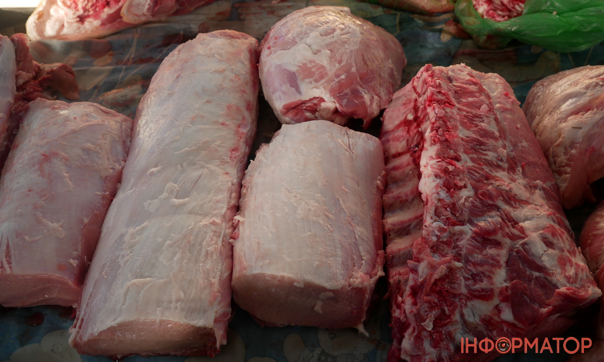 У м’ясному павільйоні торги проходили активно. Адже там вистачало всього та навіть більше. Люди, як і зазвичай, найбільше цікавилися салом та м’ясом. Біля кожного прилавку була маленька черга покупців. Можна було придбати крила куриці по 130 гривень за кіло, або ж курячі лапки по 30 гривень за кілограм. Телячий язик продавали по 350 гривень. Загалом ціни на найпопулярніші продукти незмінні: