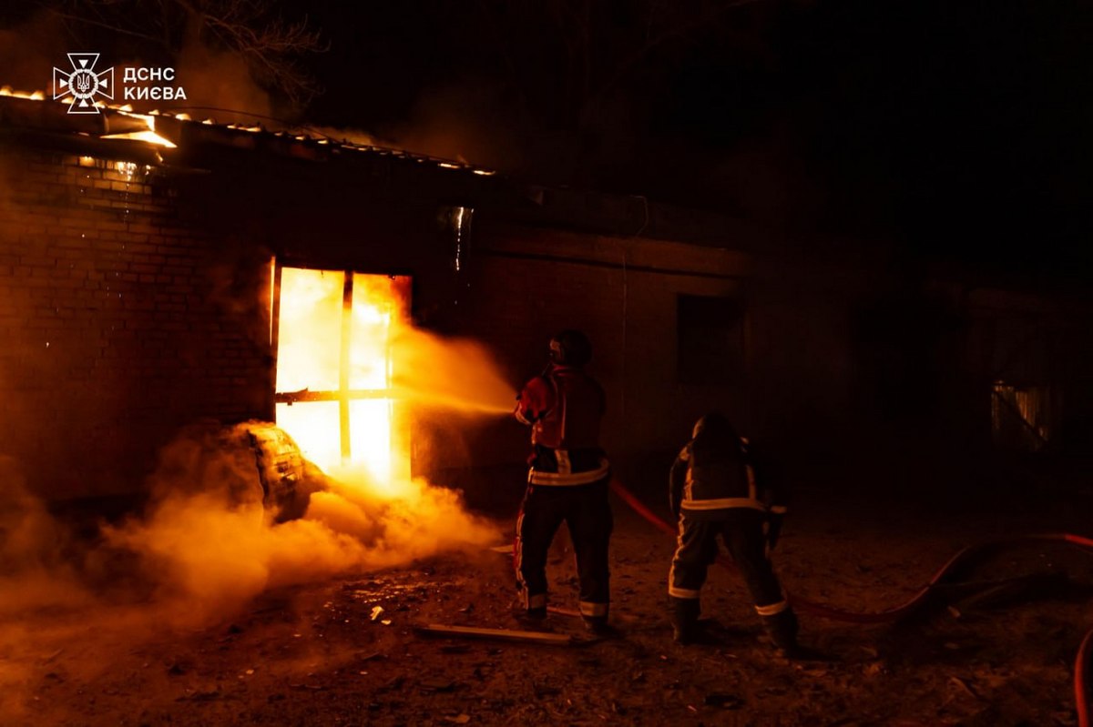 Внаслідок атаки ворожих БпЛА та падіння уламків збитих повітряних цілей в Голосіївському районі сталася пожежа на території складського приміщення. У Дарницькому районі – руйнування приватного будинку, також пошкоджено вікна будинків поруч та авто. Постраждали дві жінки. Їм надали медичну допомогу, без госпіталізації.