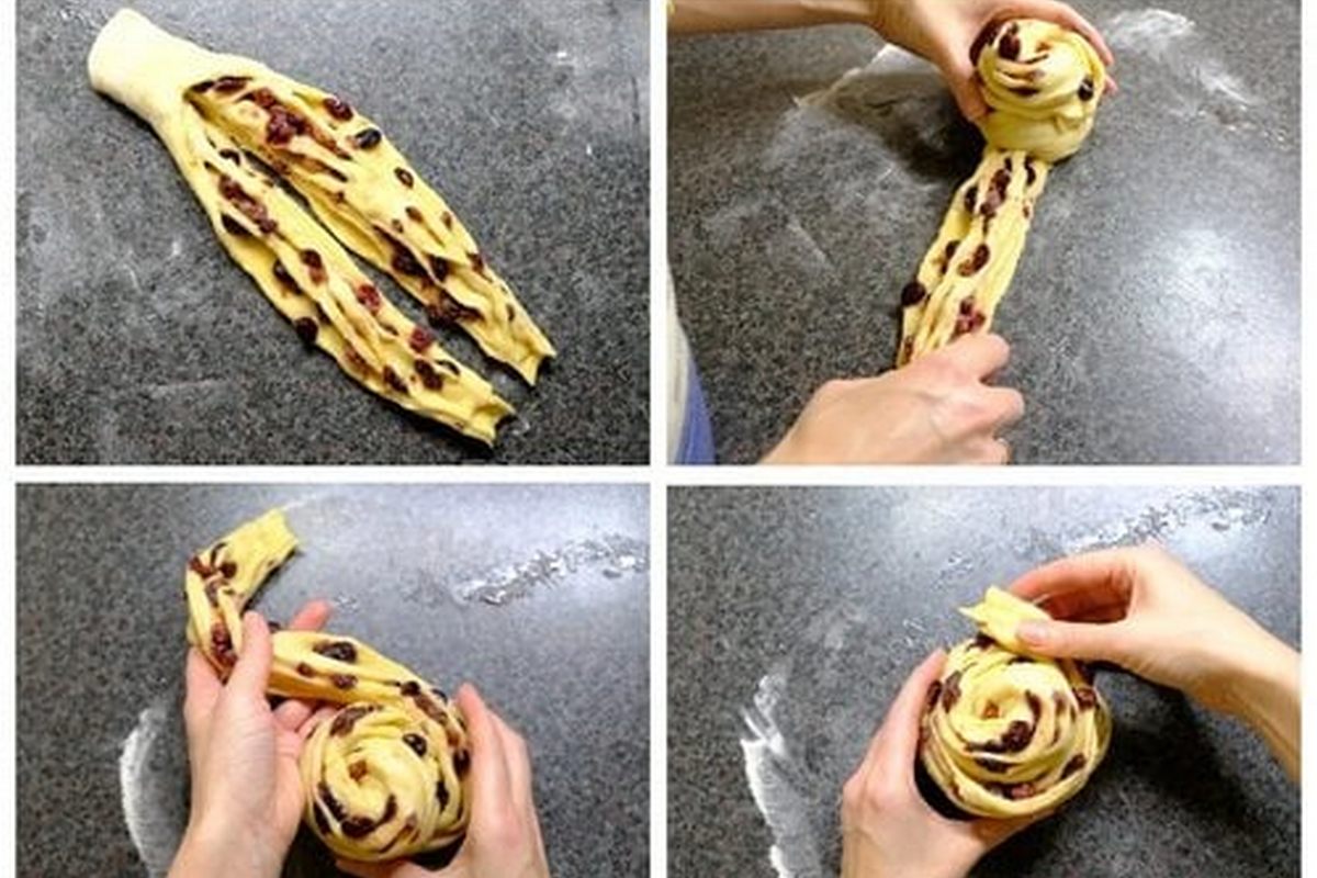 - Підготуйте начинку: замочіть родзинки/цукати у теплій воді на 10 хв., потім обсушіть.