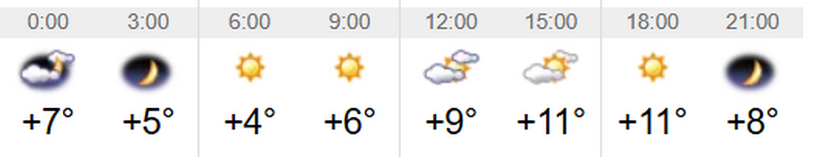 Швидкість вітру – 4-8 м/с. Вологість повітря коливатиметься між 28 та 58 відсотками протягом доби. Тривалість дня 27 квітня – 14 годин 29 хвилин. Завтра день буде на 3 хвилини довшим, ніж сьогоднішній. Світанок настане о 5:37, а захід – о 20:06.