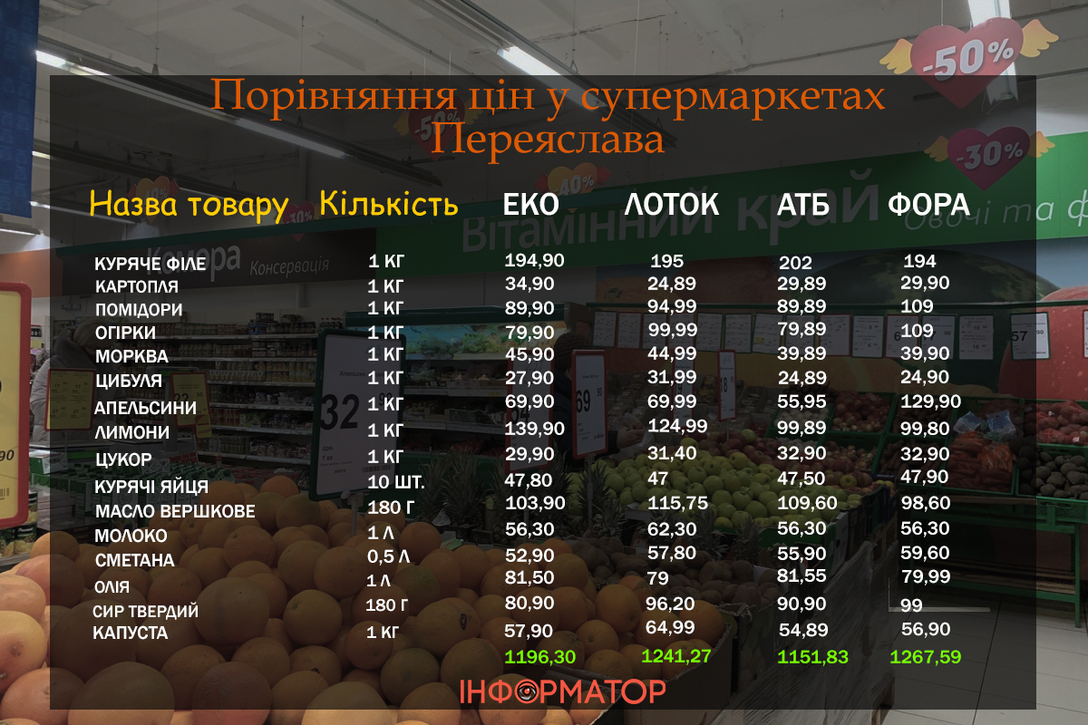У Переяславі працюють мережеві супермаркети “АТБ”, “Фора”, “ЕКО-маркет” і “ЛотОК”. Де купувати вигідніше у квітні?