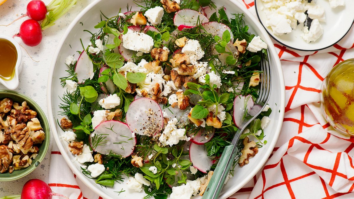 - Редиску, петрушку, м’яту та кріп перемішайте у салатниці. Посипте фетою та горіхами.