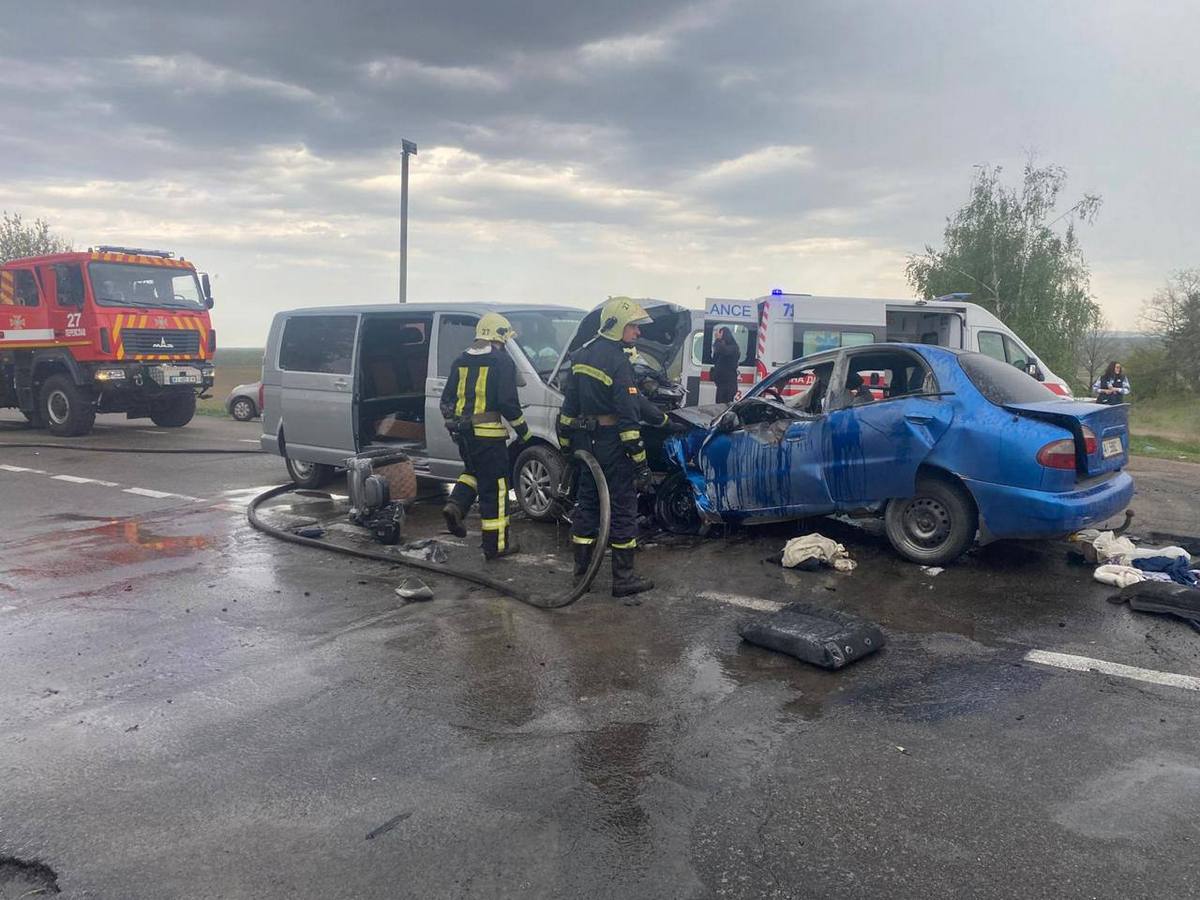 О 15:56 рятувальники прибули на місце події. Виявили, що зіткнулися автомобілі Lanos та Volkswagen Transporter Т5 внаслідок чого сталося загоряння одного з транспортних засобів. Три людини постраждали. Їх витягли з автівок перехожі до приїзду підрозділу. На місці події працювали рятувальники, медики та правоохоронці.