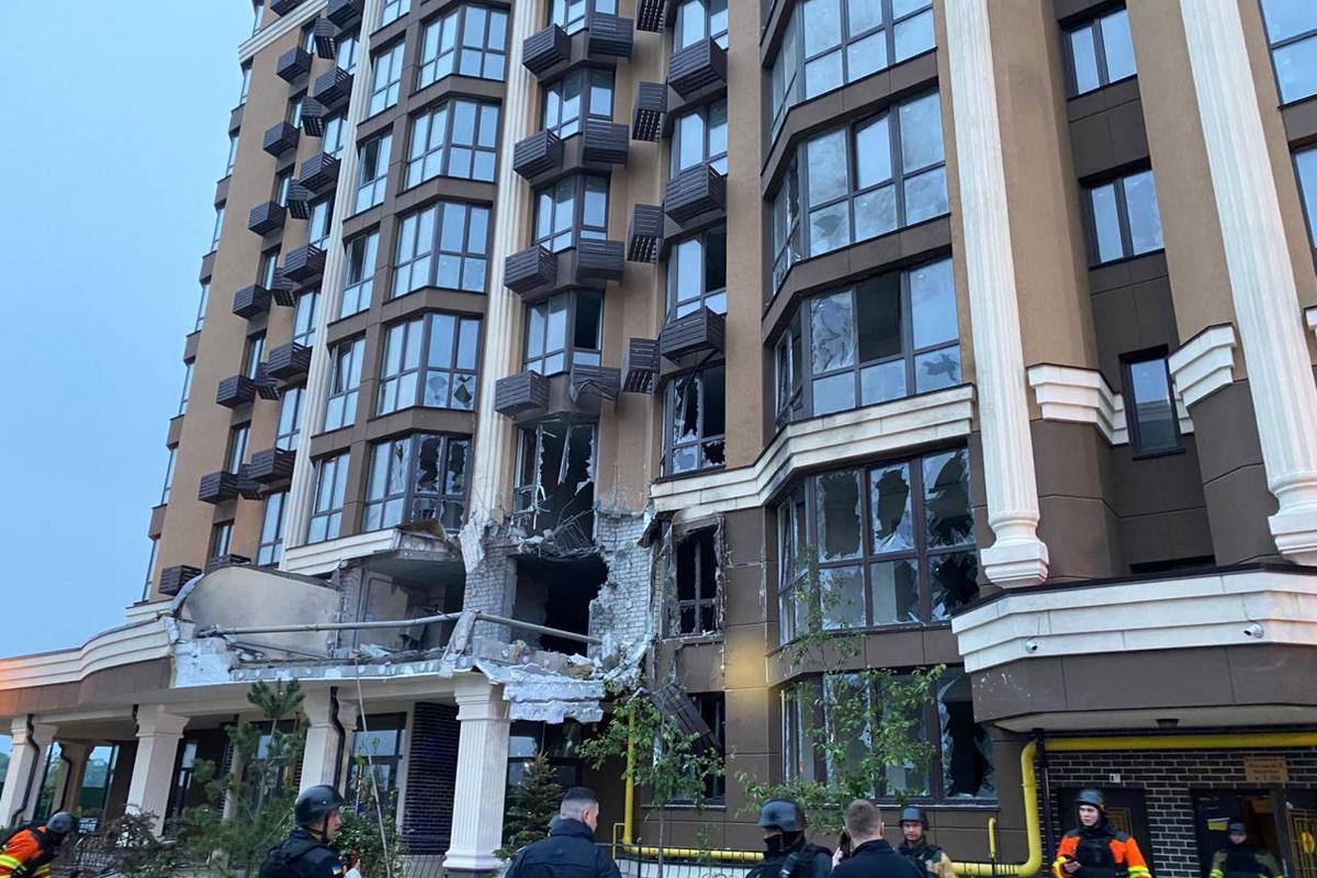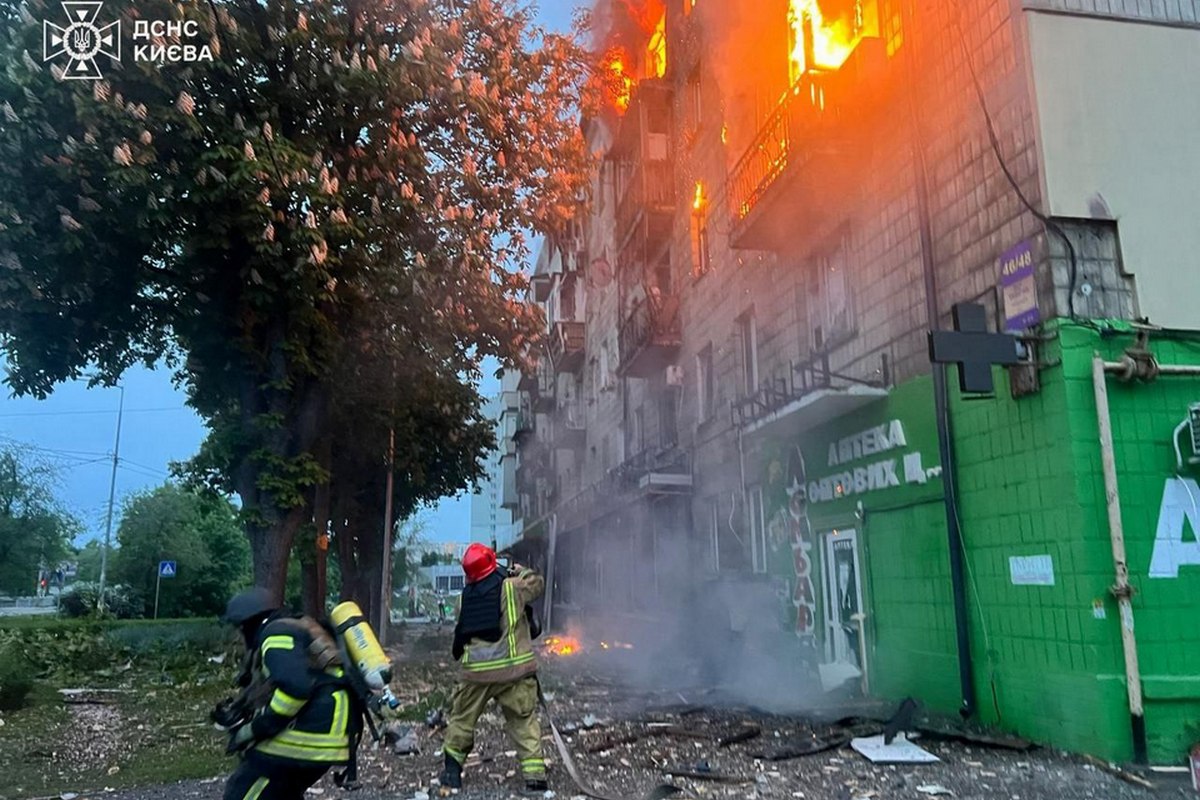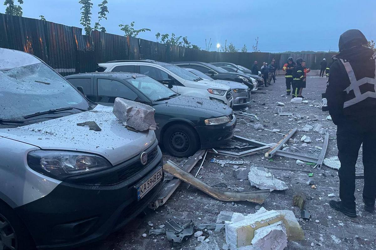 У Святошинському районі уламки влучили у 9-поверховий житловий будинок. Сталося загоряння квартир на 6-9 поверхах. Пожежу ліквідовано на площі 100 кв. м. Врятовували 5 людей – 1 дорослого та 4 дітей (3 дітей з опіками госпіталізували).