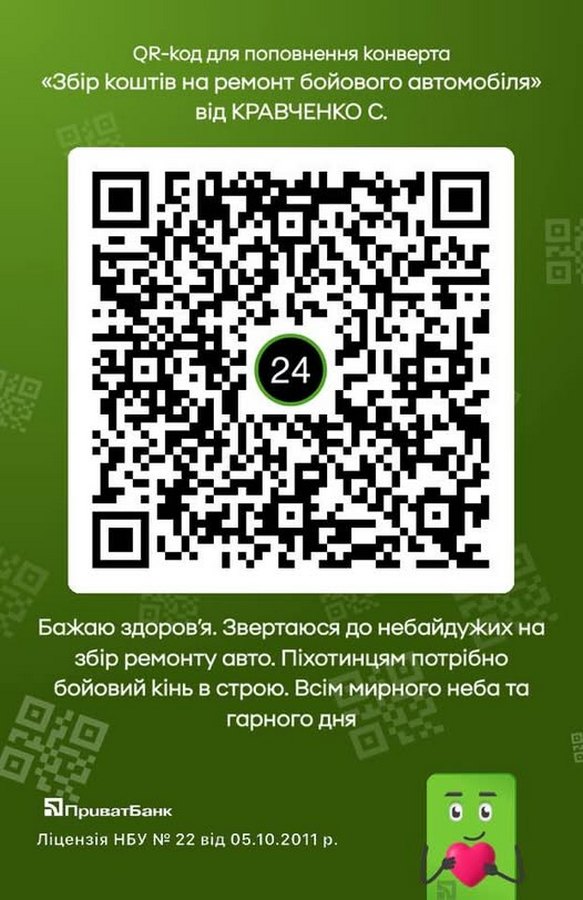 Військовослужбовець Сергій Кравченко із Переяслава відкрив збір на ремонт автомобіля, який допомагає виконувати бойові завдання піхотинцям: “Прошу всіх не байдужих долучитися до збору, нам, піхоті, потрібно зробити бойового коника”, – написав він.