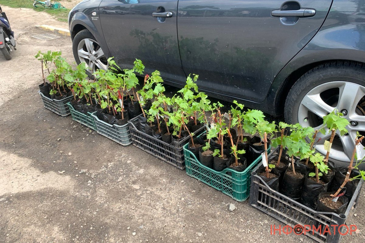 Через дорогу від наметів із розсадою переяславець Олександр продає виноград. Чоловік каже, що його в місті знають, має постійних покупців: “Мене впізнають по бірочках на кожній рослині, вони зроблені із залізних кришечок”.