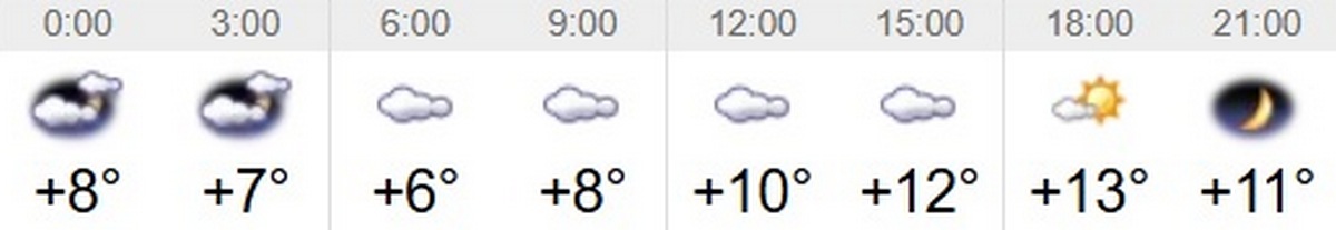 Швидкість вітру – 3-5 м/с. Вологість повітря коливатиметься між 48 та 89 відсотками протягом доби. Тривалість дня 13 травня – 15 годин 19 хвилин. Завтра день буде на 2 хвилини довшим, ніж сьогоднішній. Світанок настане о 5:11, а захід – о 20:30.