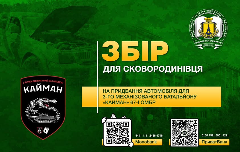 В Університеті Григорія Сковороди повідомили, що 3-й механізований батальйон “Кайман” 67-ї окремої механізованої бригади звернувся з проханням по допомогу для придбання авто. Батальйоном командує випускник університету, майор Михайло Чубінашвілі, який разом зі своїми побратимами боронить Україну на передовій.