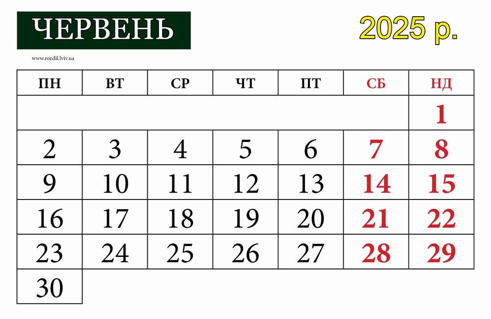 У червні українці відпочиватимуть лише по суботах та неділях, адже додаткових вихідних під час воєнного стану не надають, навіть якщо святковий день збігається із суботою чи неділею. Вихідні червня 2025 року – 1, 7, 8, 14, 15, 21, 22, 28, 29 числа. Про це повідомляє Інформатор.