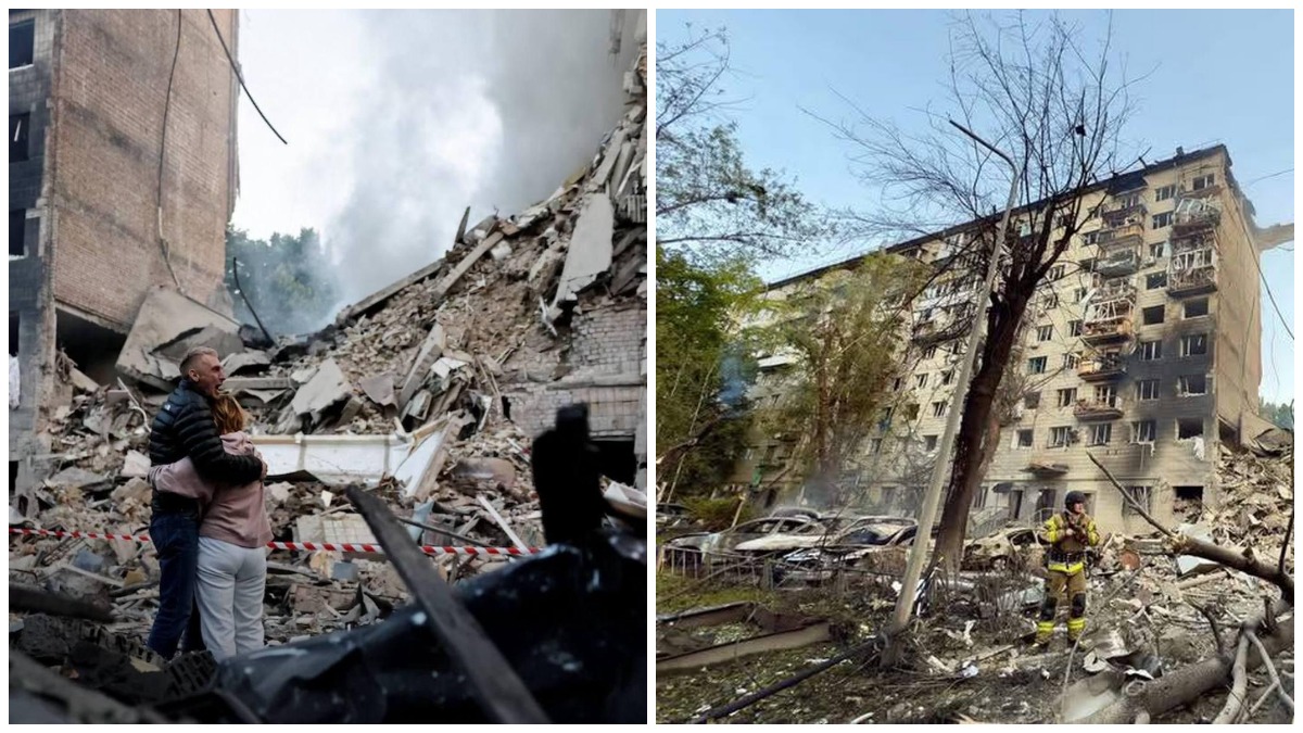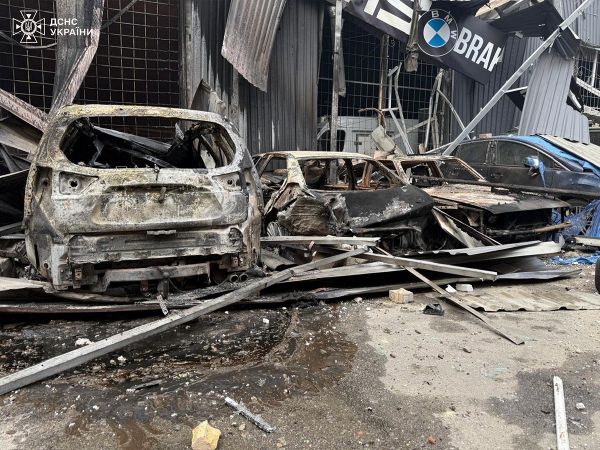 - У Солом’янському районі внаслідок влучання ракети у 9-поверхівку повністю зруйнований один під’їзд. Існує загроза обвалу конструкцій. Попередньо, загиблих тут 14. З-під завалів надзвичайники деблокували жінку. Знищено 8 авто, ще 4 горіли у дворі. Також пожежа сталася у п’ятиповерхівці та СТО.