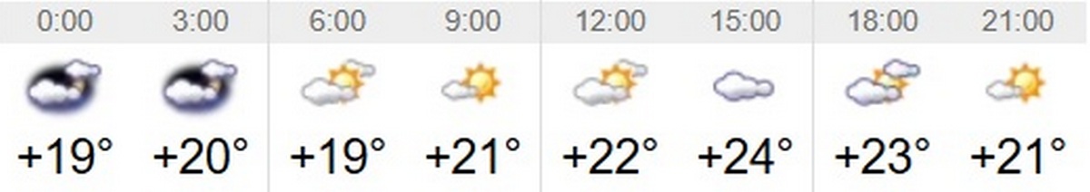 Швидкість вітру – 4-7 м/с. Вологість повітря коливатиметься між 36 та 75 відсотками протягом доби. Тривалість дня 19 червня – 16 годин 22 хвилини. Завтра день буде таким самим за тривалістю, як і сьогоднішній. Світанок настане о 4:44, а захід – о 21:06.