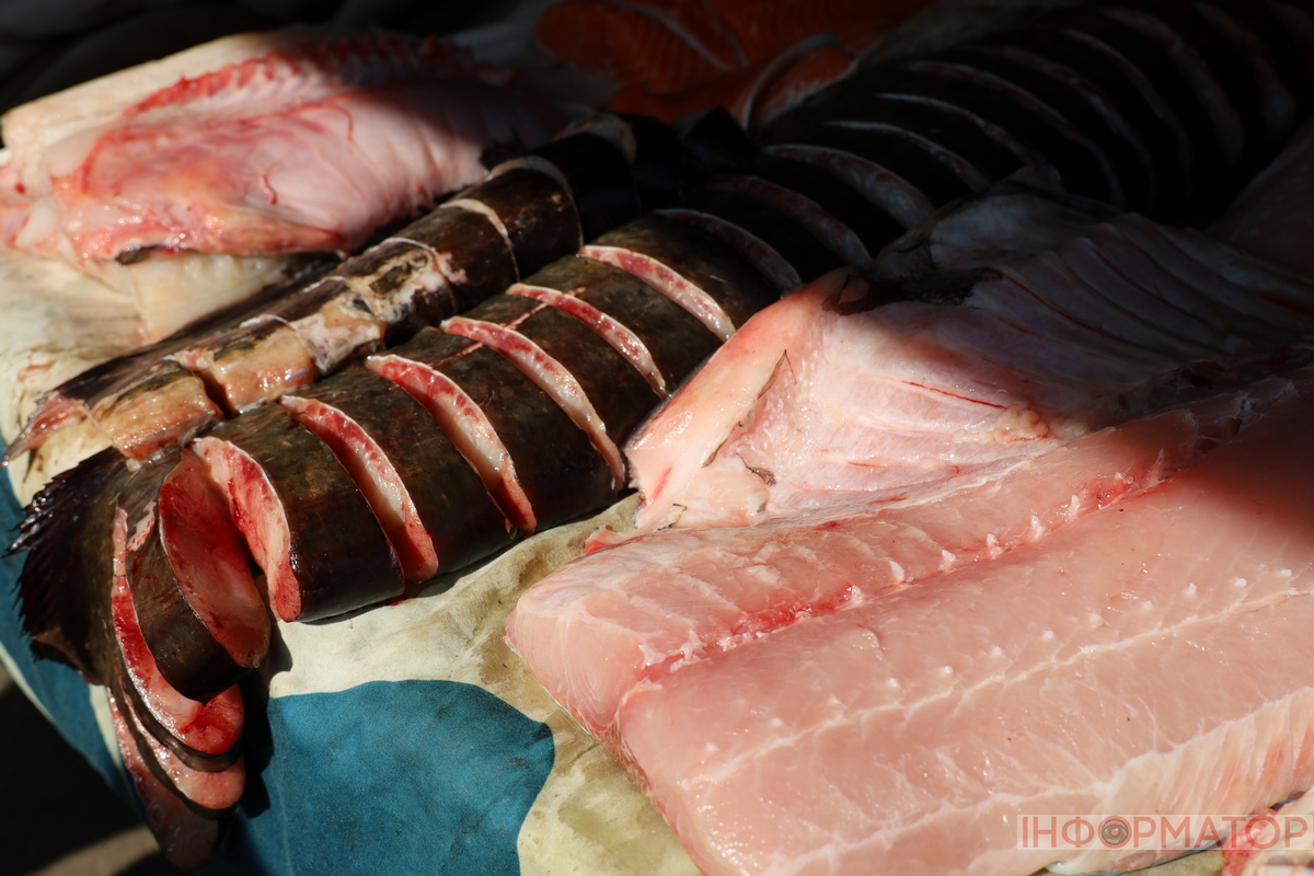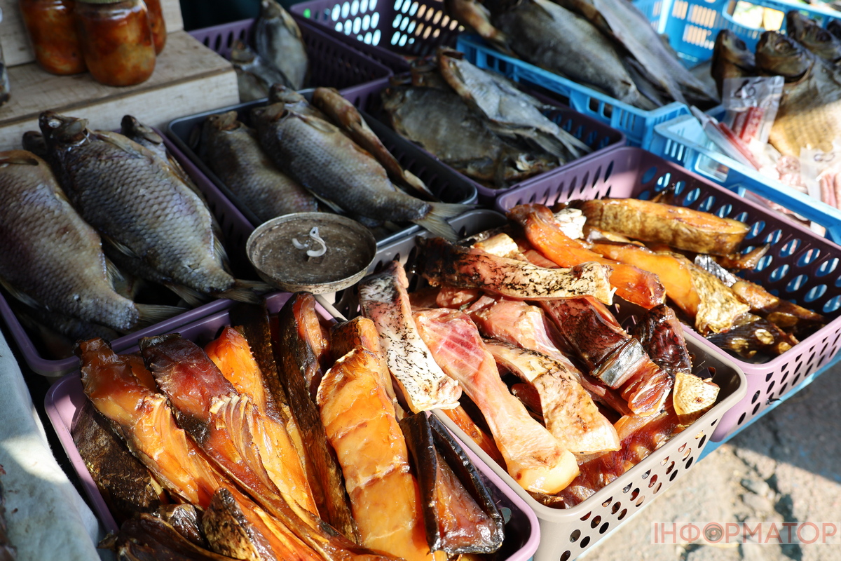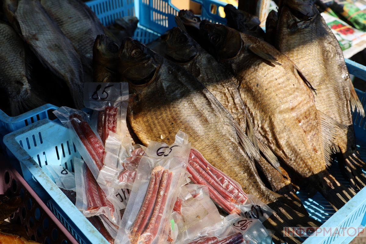 На рибних прилавках був великий вибір свіжої продукції. На червону рибу та на коропів ціна дещо зросла, тепер вони коштують по 700-800 та по 190 гривень за кілограм відповідно (були по 700 та 130-150). Ціни на весь інший асортимент залишаються майже незмінними: