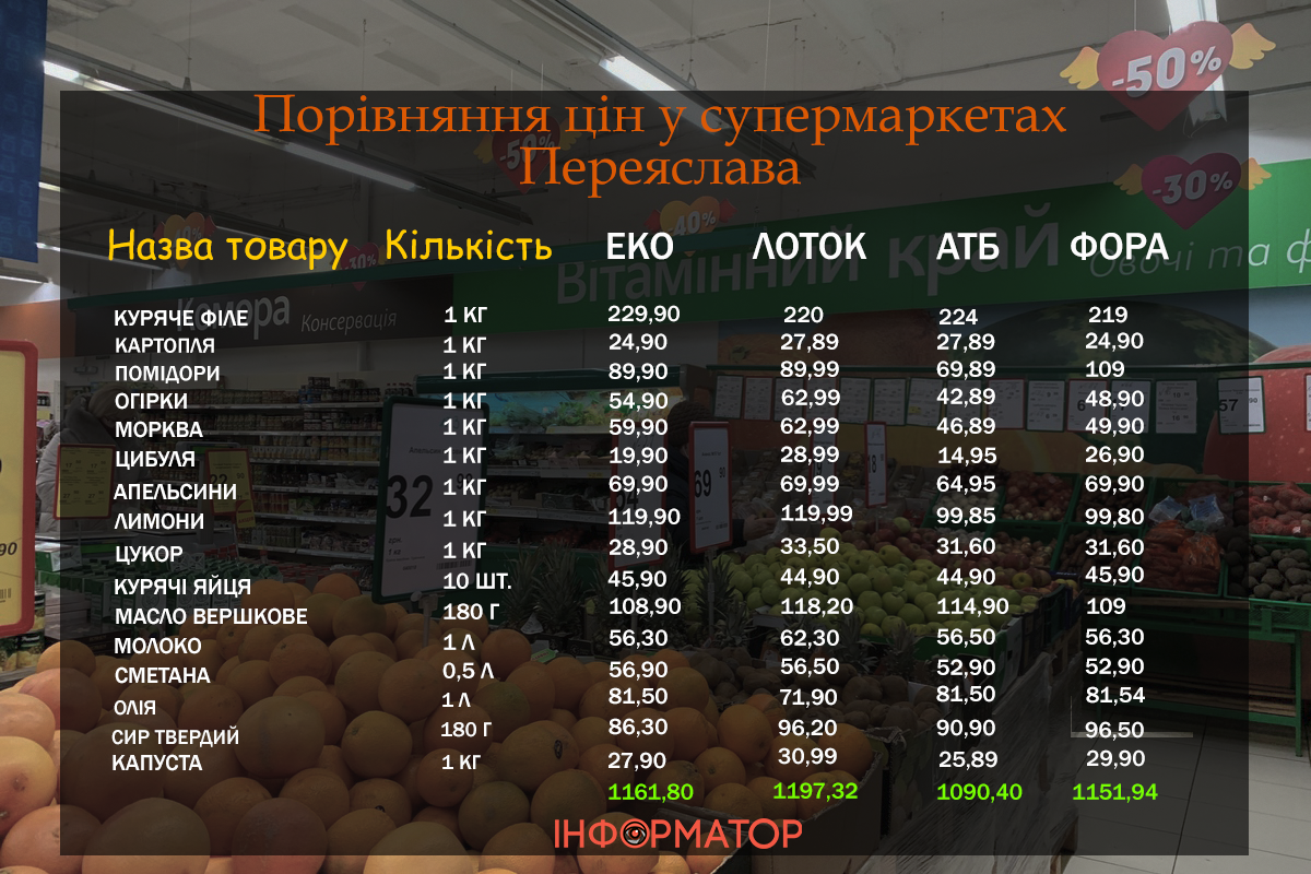 У Переяславі працюють мережеві супермаркети “АТБ”, “Фора”, “ЕКО-маркет” і “ЛотОК”. Де купувати вигідніше на початку липня?