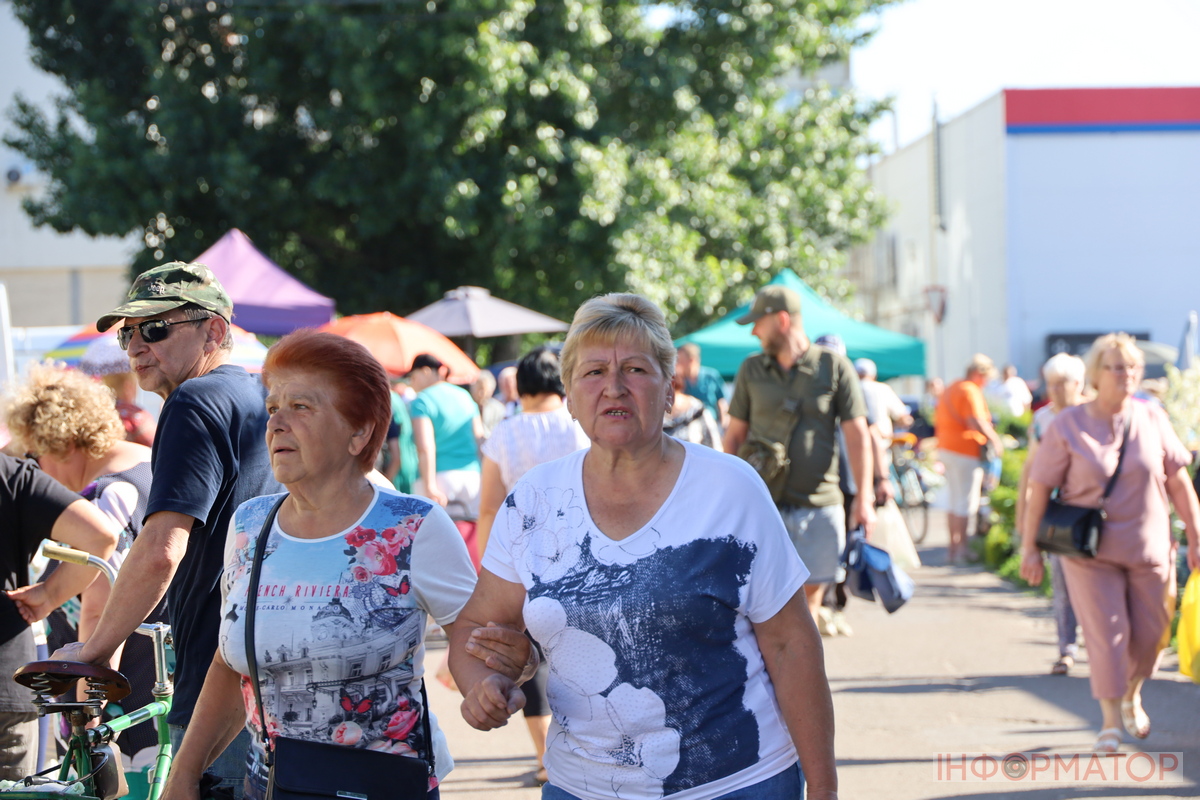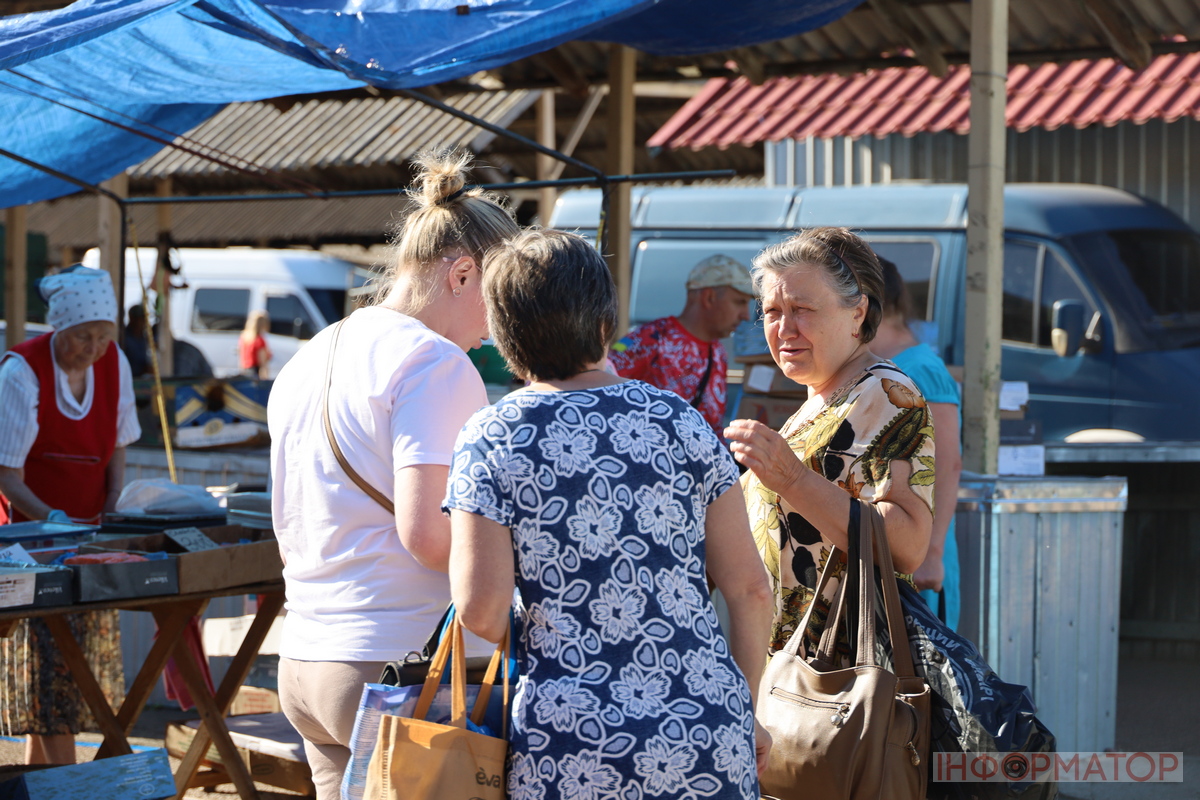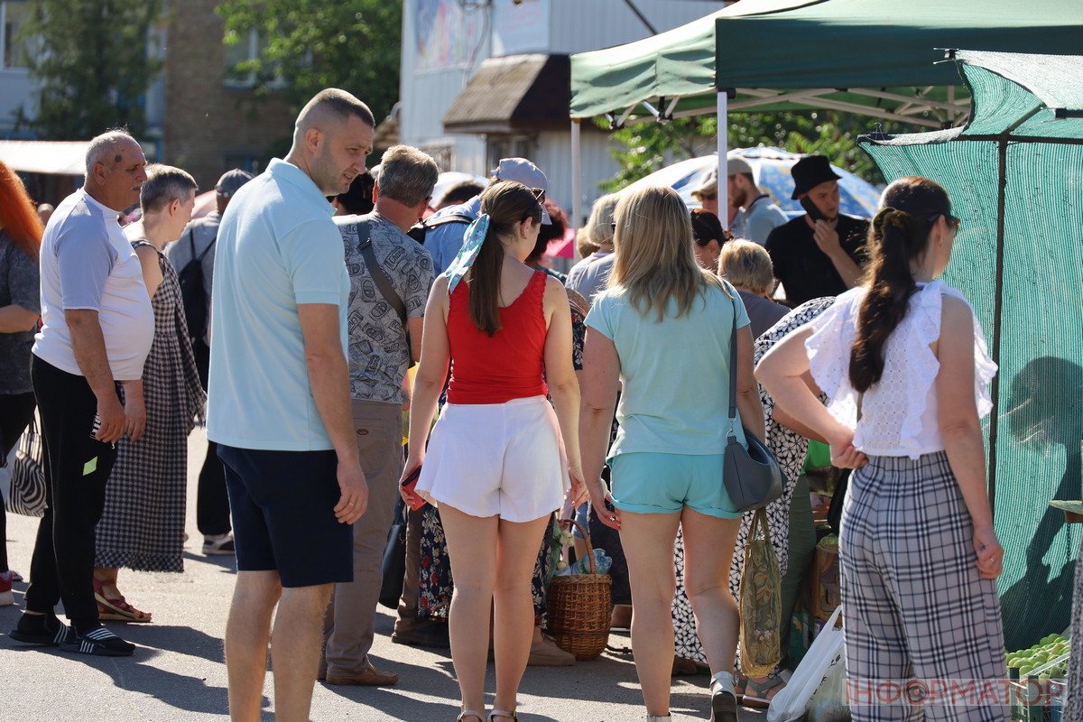 Біля овочевих прилавків – справжній ажіотаж. Ще до восьмої години покупці з кошиками й торбами вже ходили між рядами, уважно роздивляючись товар. Продавці щедро викладали врожай на прилавки – усе яскраве, соковите, ніби щойно з грядки: помідори, огірки, пучки зеленої цибулі й кропу. Люди зупинялись, торгувались, обирали найкраще, порівнювали ціни.