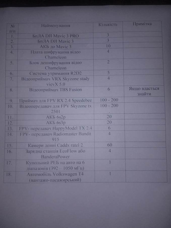 Голова ГО “4.5.0. Переяслав” Руслан Стародуб повідомив, що триває збір для підрозділу аеророзвідки 30-ї бригади. “Список запитів дуже великий, на суму приблизно 2 мільйони гривень. Наша задача по максимуму закрити пункти з цього списку”, – написав волонтер.