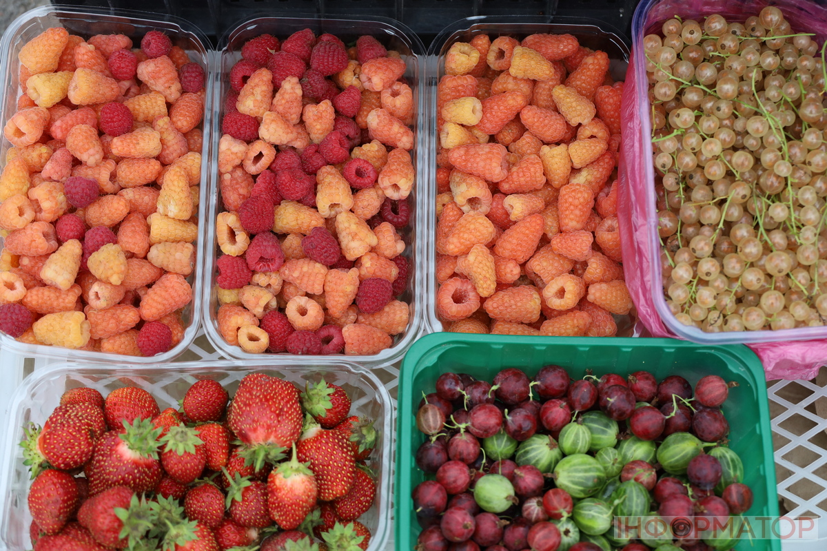 На фруктових прилавках базару цього тижня найбільше впадало в око суттєве зменшення асортименту. Домашні яблука, вишні та абрикоси траплялися лише поодиноко і у невеликих кількостях, що, очевидно, пов’язано з завершенням сезону. Попри це, можна було знайти свіжі сливи – їхній ціновий діапазон залежав від розміру плодів і коливався від 50 до 110 гривень за кілограм. Ягід на прилавках стало значно менше. Лише деякі продавці продовжували розпродувати малину за ціною 200-230 гривень за кілограм, що свідчить про високу вартість цієї ягоди через обмежену пропозицію. Лохина, навпаки, подешевшала порівняно з минулим тижнем: тепер її можна було придбати за 230-300 гривень за кілограм.