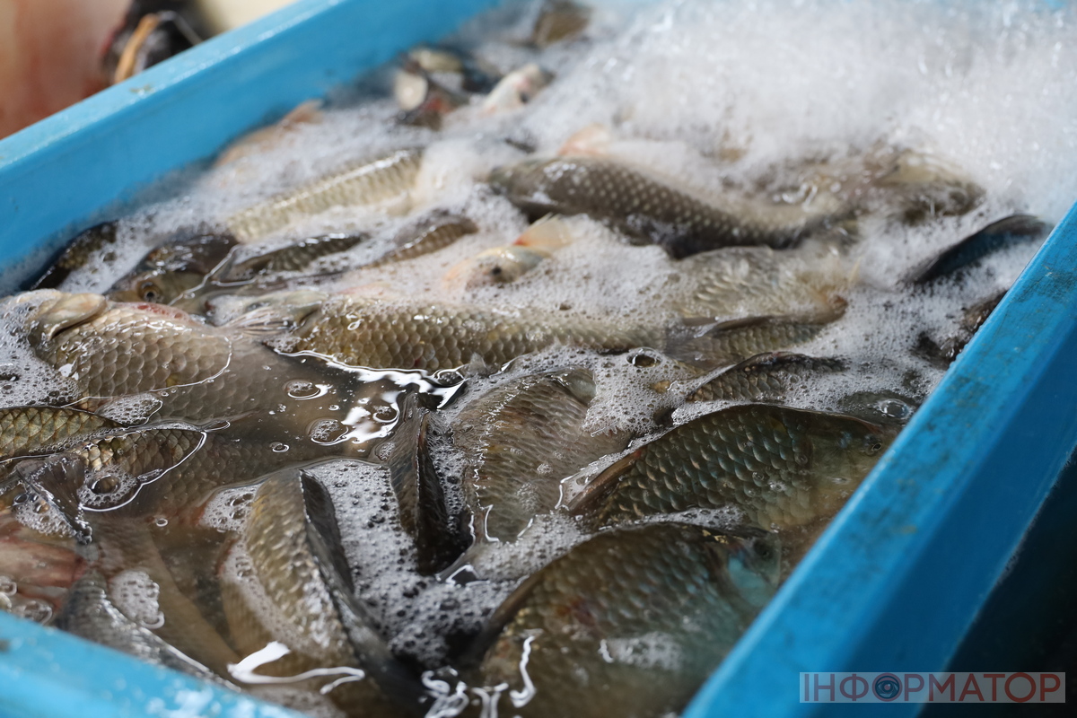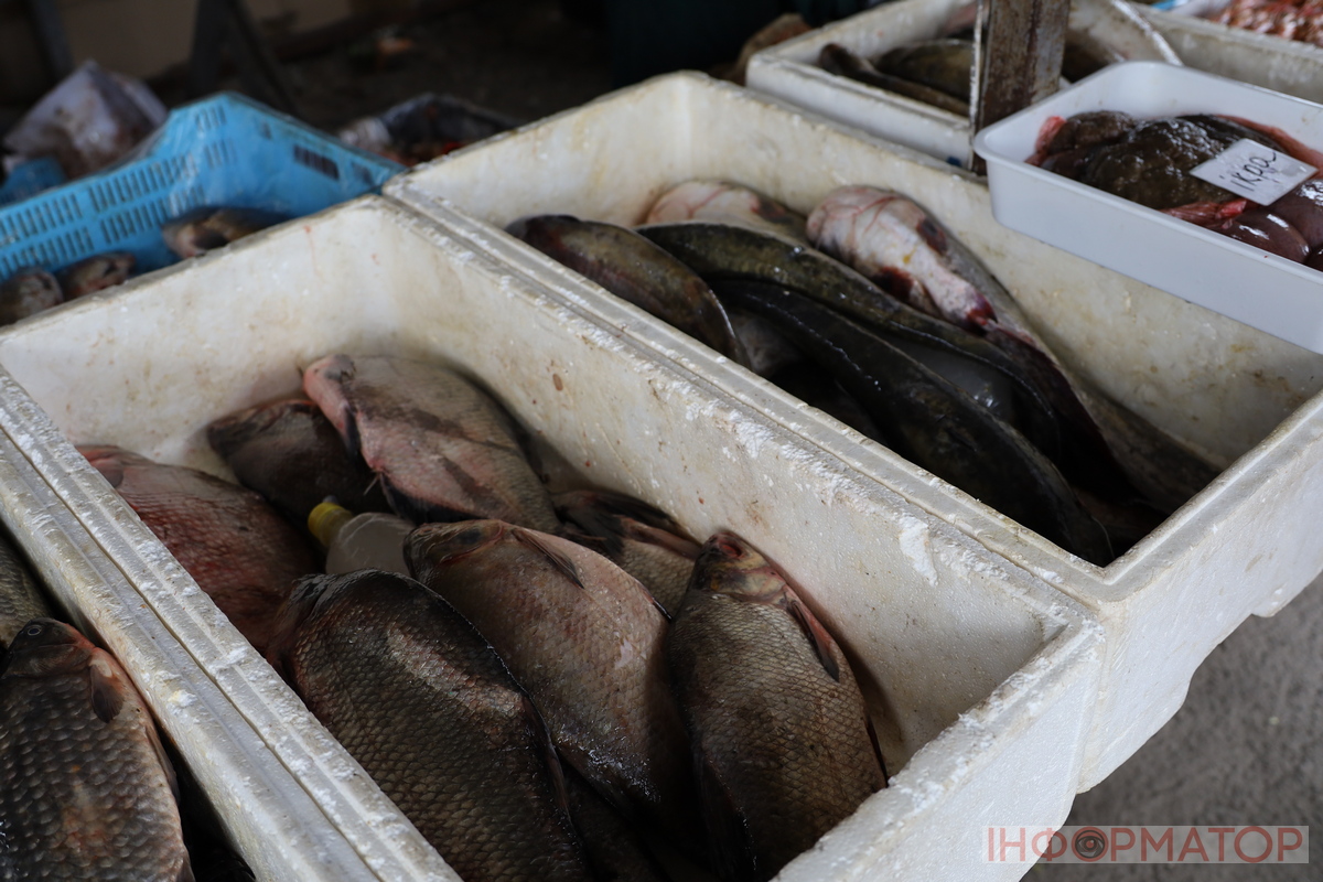 Рибні прилавки традиційно були наповнені свіжою різноманітною продукцією. Короп коштував близько 190 гривень за кілограм, а товстолоби – від 90 до 100 гривень. Креветки продавалися в середньому по 500 гривень за кілограм. Продовжували продавати ікру товстолоба, її ціна не змінилася – 150 гривень за кілограм.