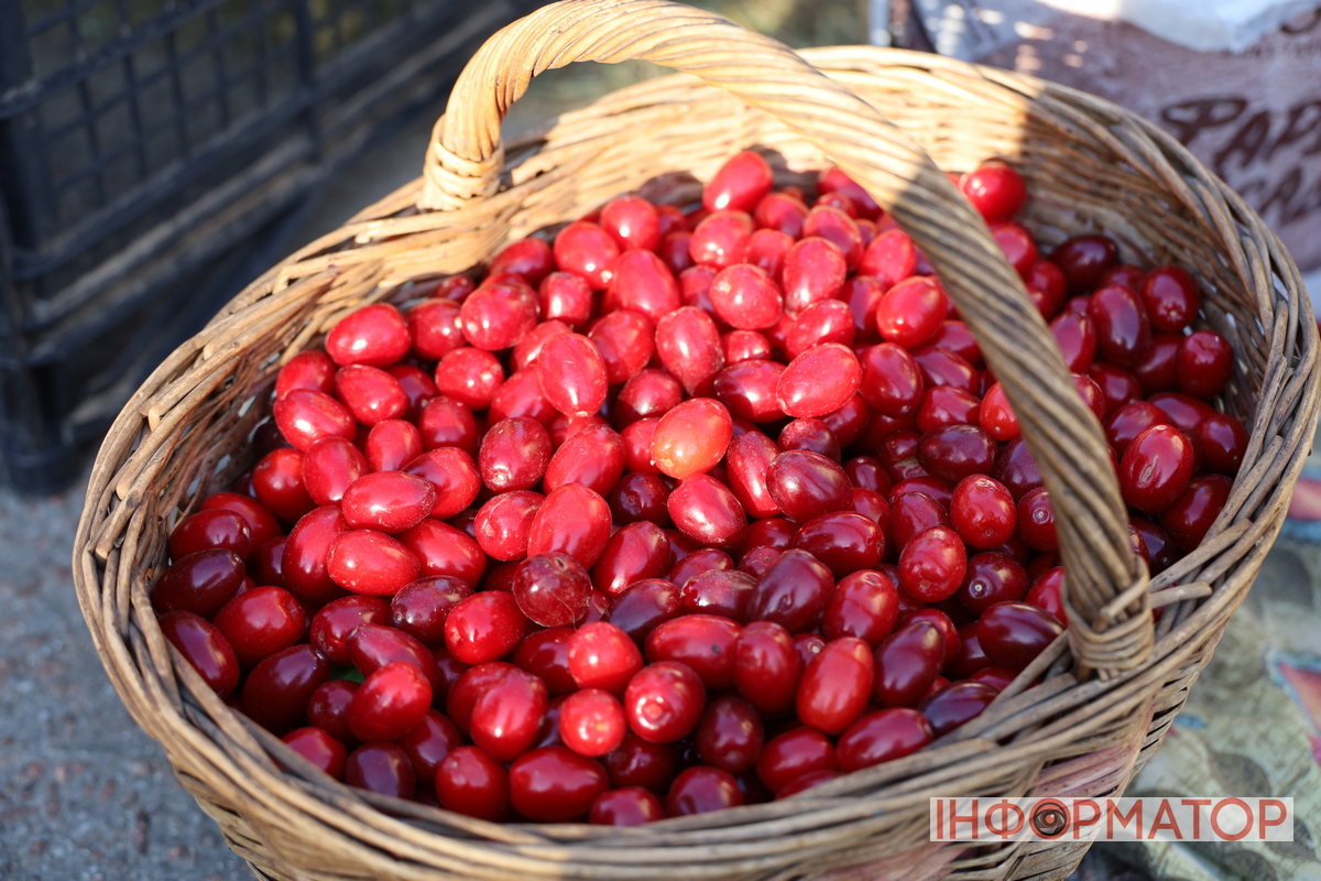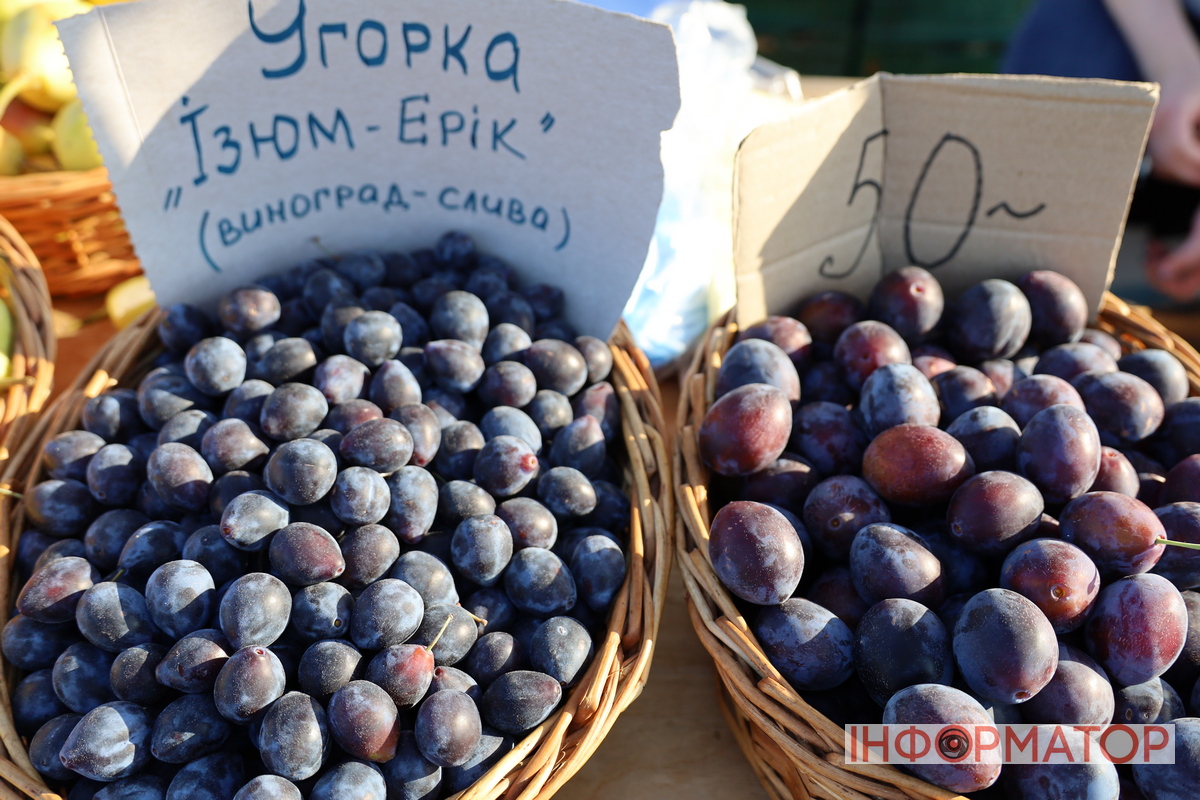 На фруктових прилавках асортимент нині скромніший. Багато слив, які продавали від 40 до 110 гривень за кілограм. Малину й ожину пропонують по 200–250 гривень за кілограм, а лохину по 200–250. Це вже останні ягоди сезону. Також траплялась і лісна обліпиха, продавали її по 50 гривень за стаканчик. Дині з Херсонщини коштують близько 62 гривень за кілограм, але також продавали й по 40, бо, як діляться продавці, ці дині трошки не доїхали – вони м’які та ніжні, і поки довезеш з півдня, вже й “мнуться”. Кавунів на ринку значно більше, ціна коливалася від 15 до 21 гривні за кіло. Кізіл пропонували по 60–70 гривень за кілограм, але станом на восьму ранку на нього попиту не було.