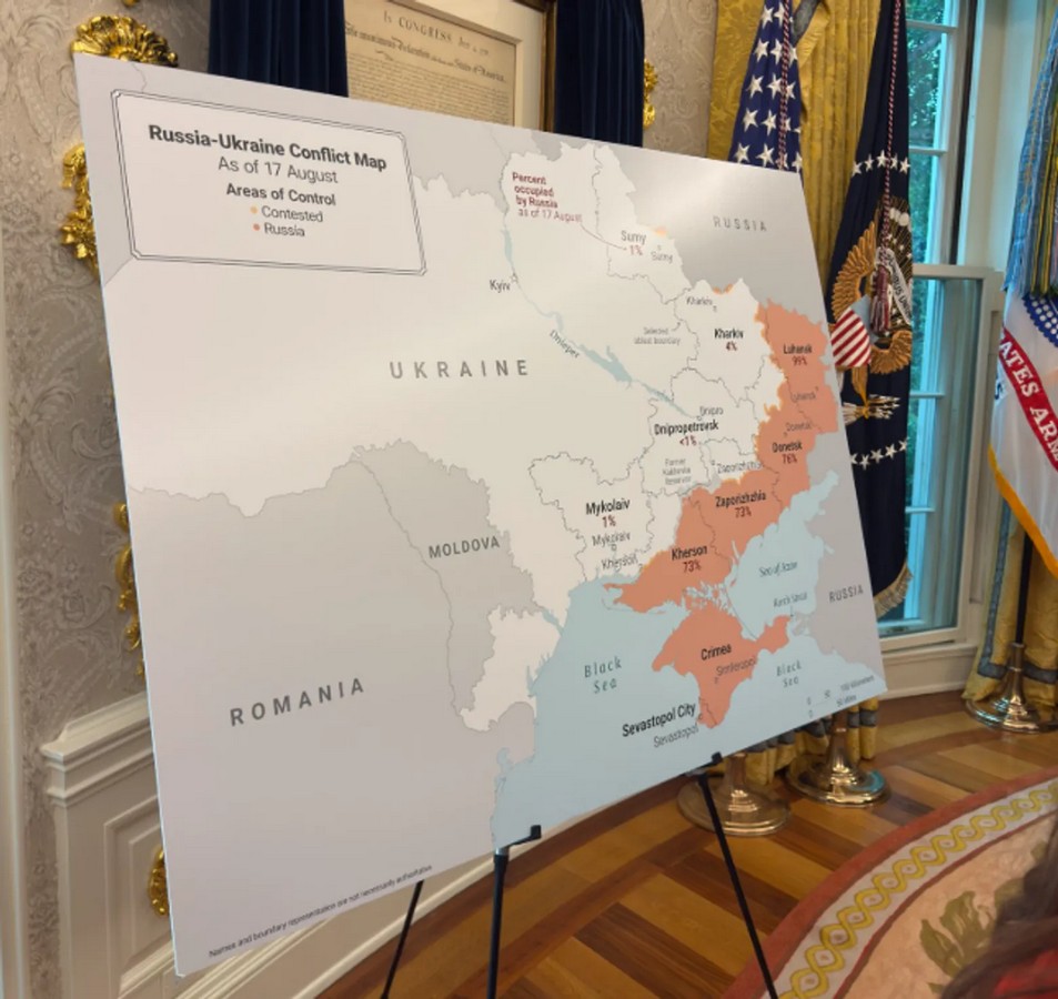 Близько 21:00 (за київським часом) публічна частина зустрічі Дональда Трампа та Володимира Зеленського в Овальному кабінеті закінчилась. І лідери перейшли до двохстороніх перемовин. Як стало відомо згодом, в Овальному кабінеті виставили карту України із заштрихованими територіями, які окупувала Росія. Кореспондент BBC Ентоні Зеркер повідомив, що східна частина України – приблизно 20% території, окупованої росіянами, – була позначена рожевим кольором. Карту виставили прямо навпроти столу, за яким сиділи президенти під час пресконференції перед зустріччю. На думку Зеркера, таким чином Трамп намагався тиснути на Зеленського, щоб той погодився віддати Росії території в обмін на мир.