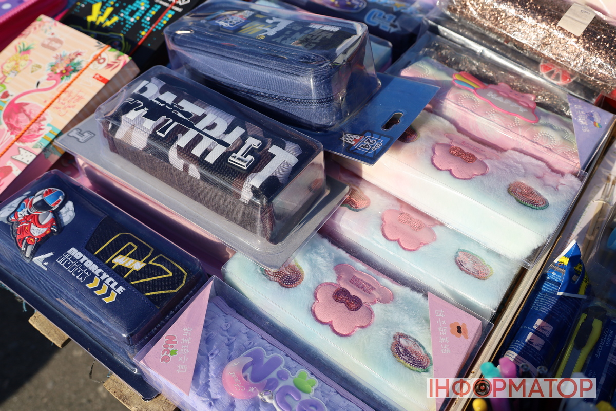 Також на базарі був великий вибір пеналів. Звичайні тканинні можна знайти за 45-60 гривень, а з малюнками, міцнішої тканини або іншого матеріалу – до 250 гривень. Окрім того, у продажу є папки для ручної роботи – їхня ціна близько 100 гривень. “У таку папку можна скласти ножиці, пластилін, скотч, олівці, пензлики та інші матеріали для творчості”, – каже продавчиня. Для звичайних зошитів пропонують папки по 65 гривень. Також є папки з ручками: вони більш м’які та зручні, а їхня ціна відрізняється залежно від малюнків та міцності – від 120 до 220 гривень.
