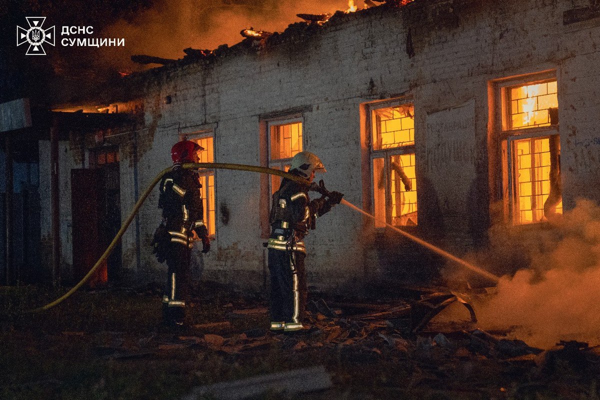 У Сумській ОВА повідомили, що внаслідок нічної атаки у Сумах спалахнула масштабна пожежа. Росіяни пошкодили нежитлові будівлі у Зарічному районі міста. Також внаслідок влучання дрона поблизу залізничної станції на Сумщині постраждала чергова по станції. Жінку доправили до лікарні.