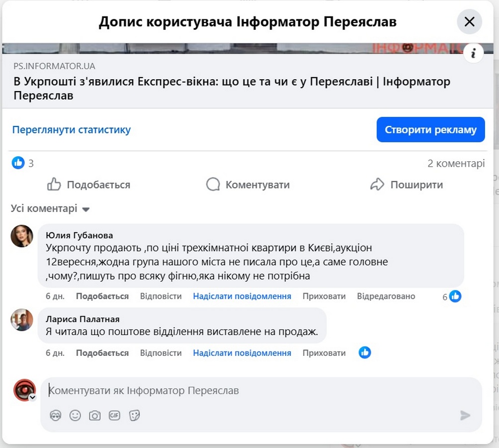 Можливий продаж центральної “Укрпошти” викликав чималий резонанс серед переяславців у соцмережах. Зокрема, і під дописом Інформатора про експрес-вікна у відділеннях залишали такі коментарі: “Укрпочту продають по ціні трехкімнатноі квартири в Києві, аукціон 12 вересня, жодна група нашого міста не писала про це, а саме головне, чому? пишуть про всяку фігню, яка нікому не потрібна”.