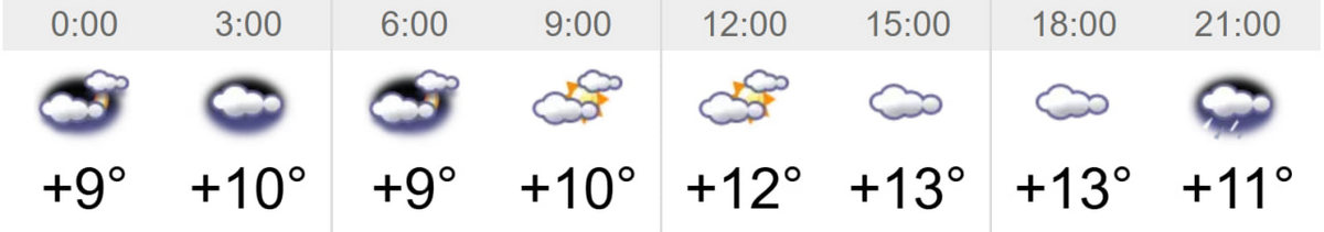У понеділок, 6 жовтня, зранку до самого вечора у Переяславі небо буде вкрите хмарами. Ранок і день пройдуть без опадів. Увечері можливий сильний дощ. Мінімальна температура повітря буде вночі та вранці – 9 градусів тепла. Максимальна вдень та ввечері – 13 градусів вище нуля. Про це повідомляє Інформатор, посилаючись на sinoptіk.