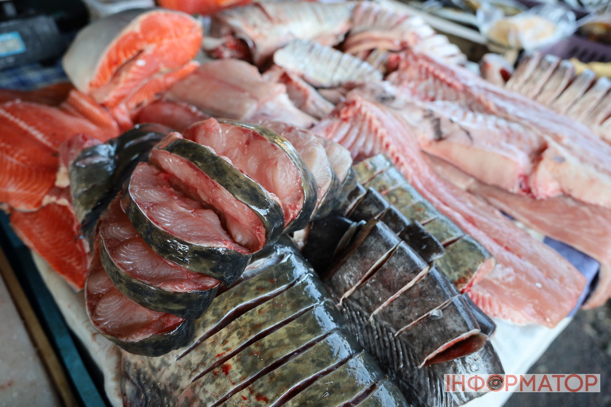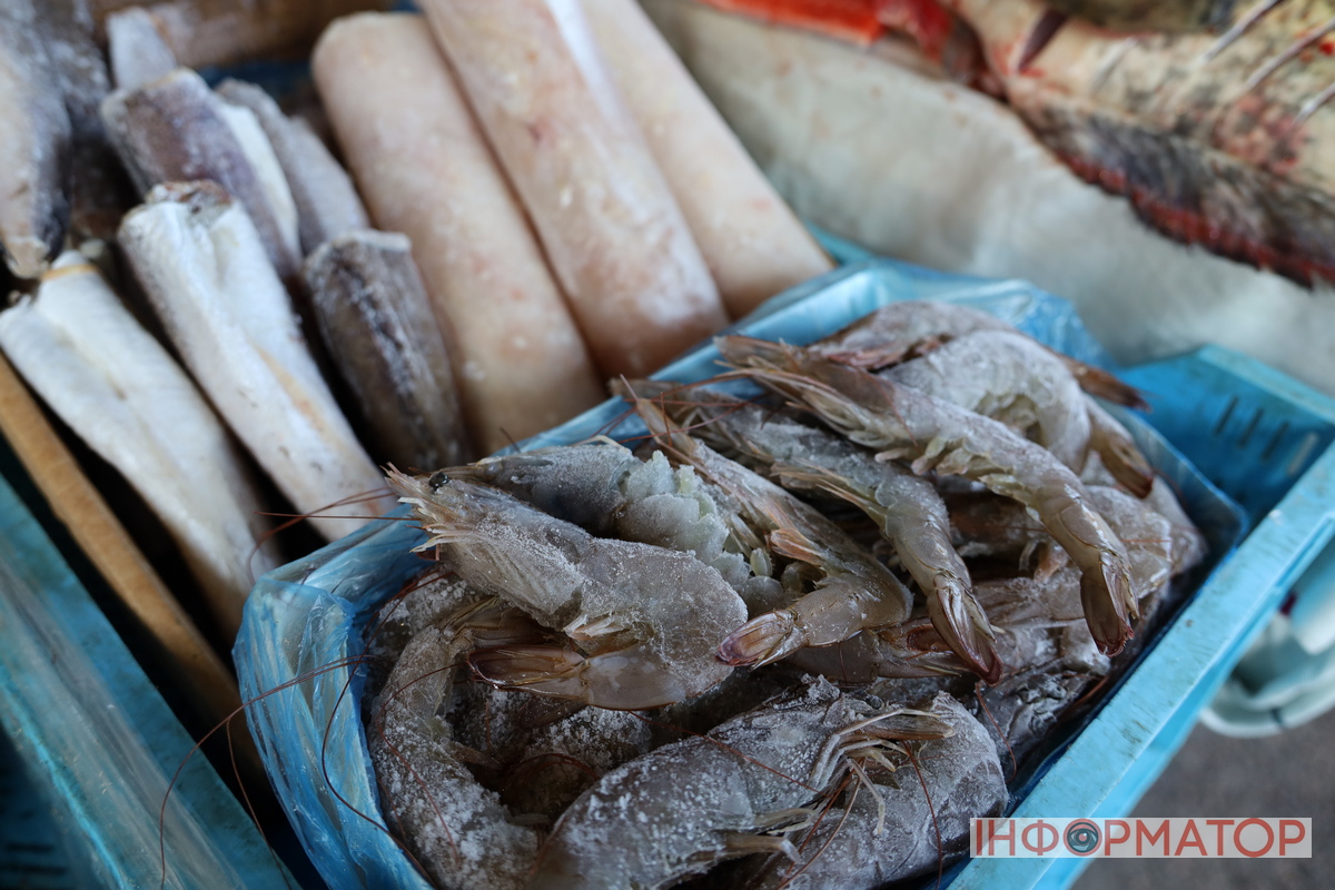 У рибних ятках ціни залишалися стабільними, як і на минулої неділі. Серед популярних товарів особливо виділялися креветки – їх продавали по 500 гривень за кілограм. Філе червоної риби коштувало 700-800 гривень за кілограм, а судак – 180 гривень за кілограм. Коропа можна було придбати за 170 гривень за кілограм. Продавці активно пропонували покупцям свіжу рибу, підказували, як краще приготувати чи зберігати продукти. Біля прилавків завжди стояли люди, вибираючи рибні продукти.