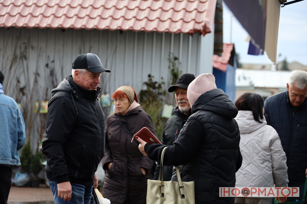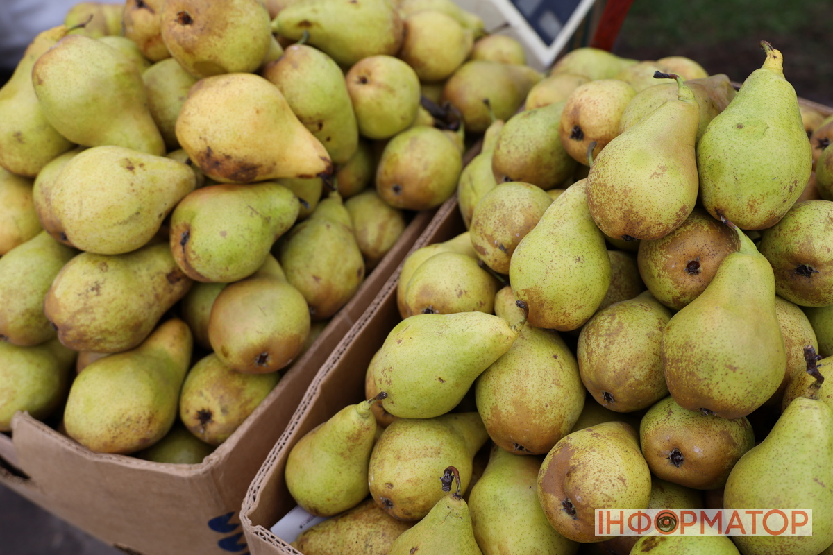Біля одного з прилавків стояло кілька покупців, які розглядали груші – продавець давав спробувати скибочку, пояснюючи, що це “домашні, солодкі, з власного саду”. Груші користувалися попитом, їх пропонували за 45-100 гривень за кілограм. Люди брали по кілька кілограмів, здебільшого на компоти чи для сушіння.