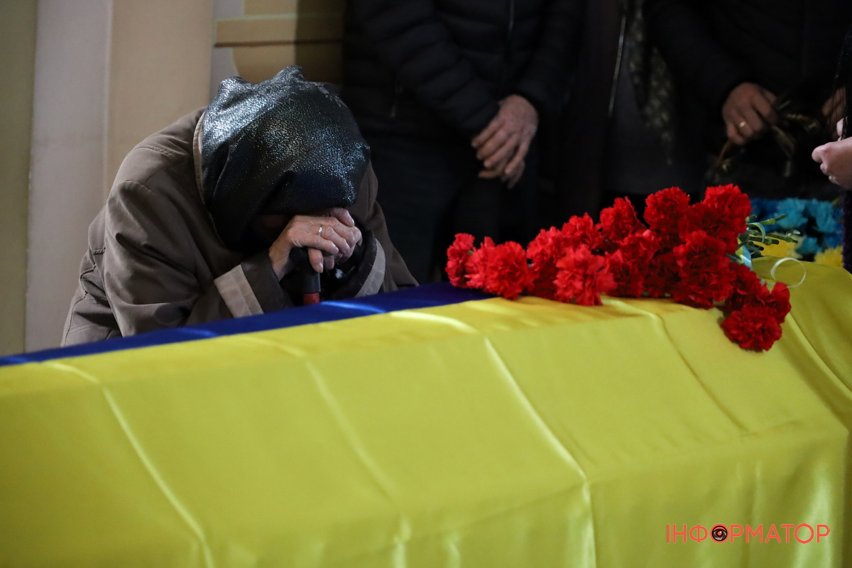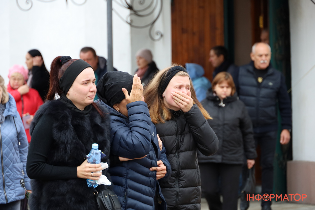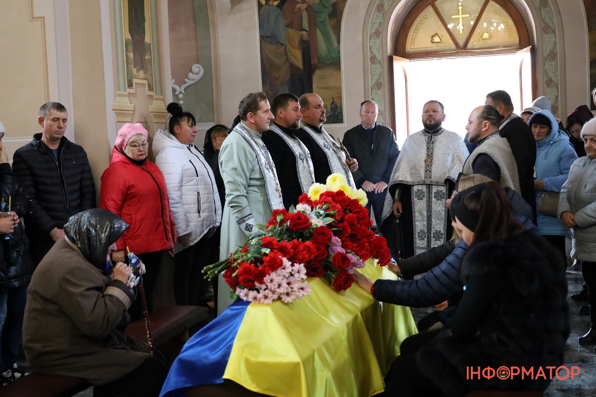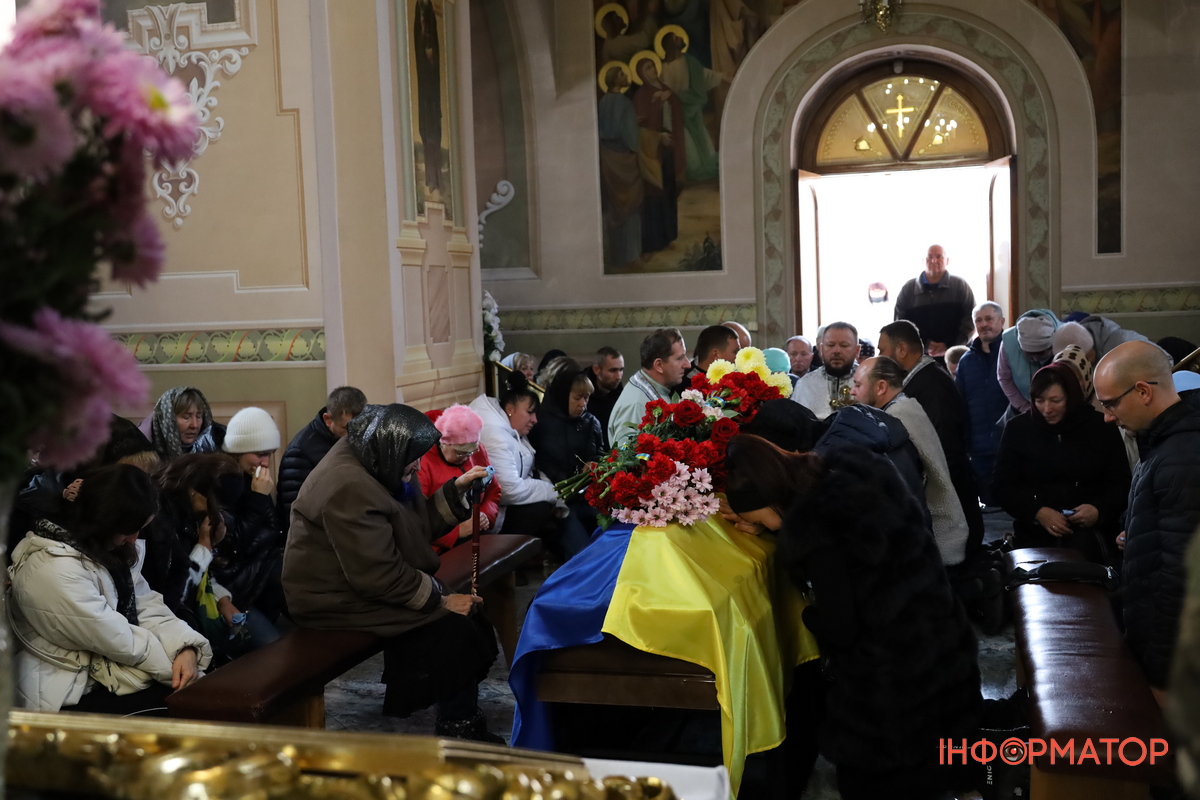 Заупокійну літургію провели у Храмі Воскресіння Христового. Там зібралося близько сотні людей: рідні, друзі, знайомі, однокласники, також прийшли й представники влади. Дружина та доньки військового сиділи разом та безупинно оплакували свого чоловіка та батька, притулялись чолом до домовини, вкритої блакитно-жовтим прапором.