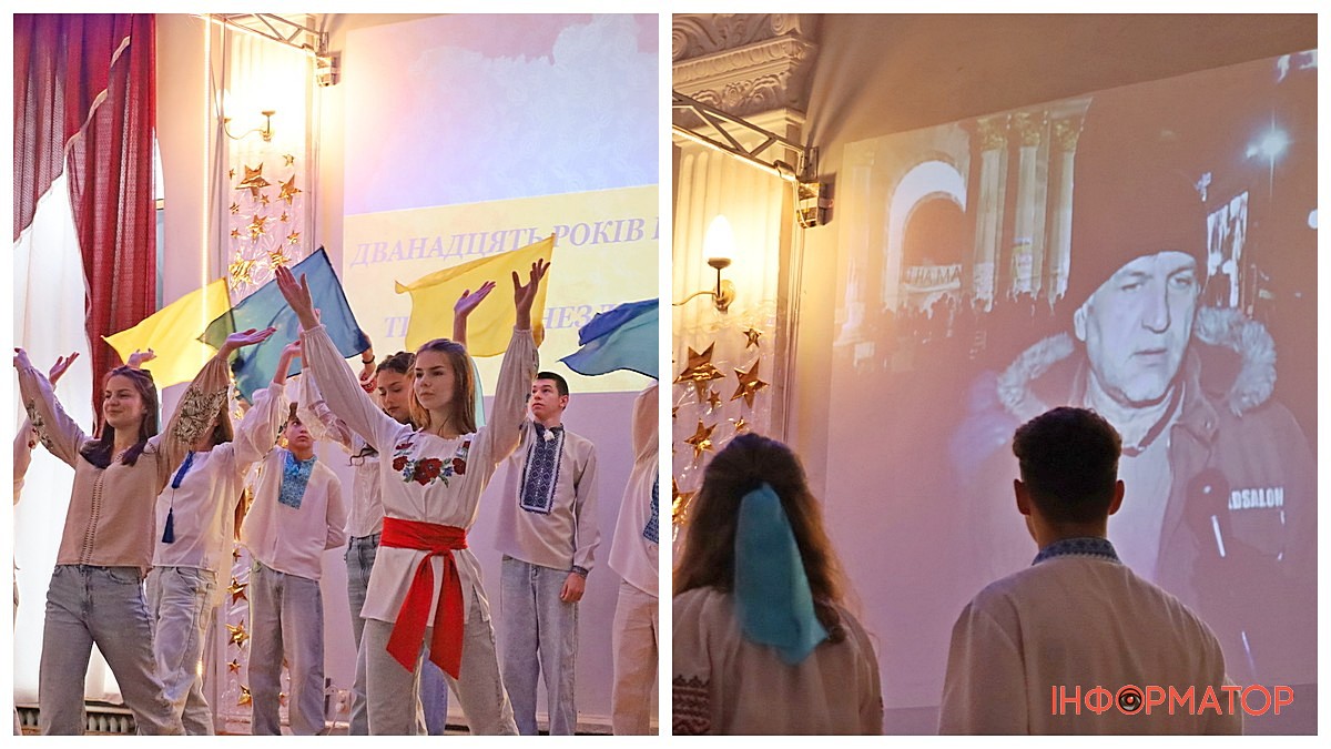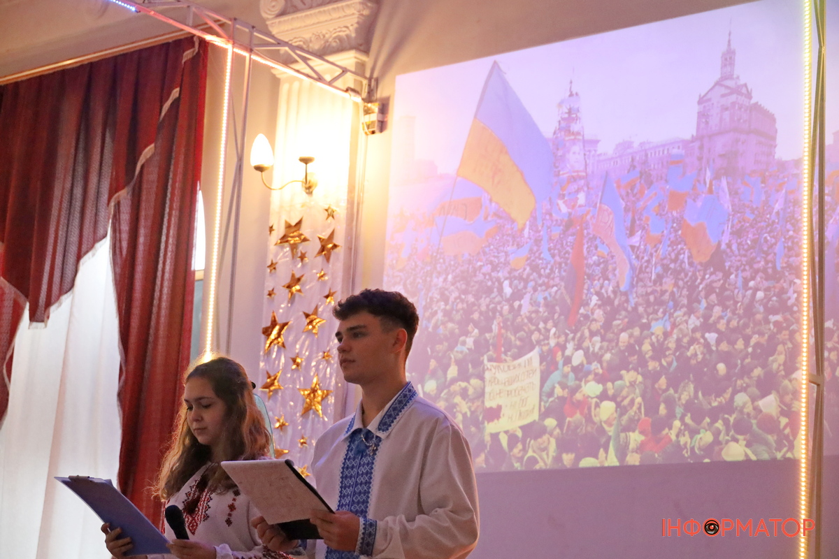 Учні розпочали з патріотичної танцювальної композиції “Україно, ми – сила”. Тоді ж зпрозвучала розповідь про історію Революції Гідності 2013-2014 років: з чого все починалося у Києві, участь студентів, битви з “Беркутом”, перші жертви та запекла боротьба українців. У цей час на екрані показали фрагмен із кінохроніки ТРК “Альта” про початок Майдану.