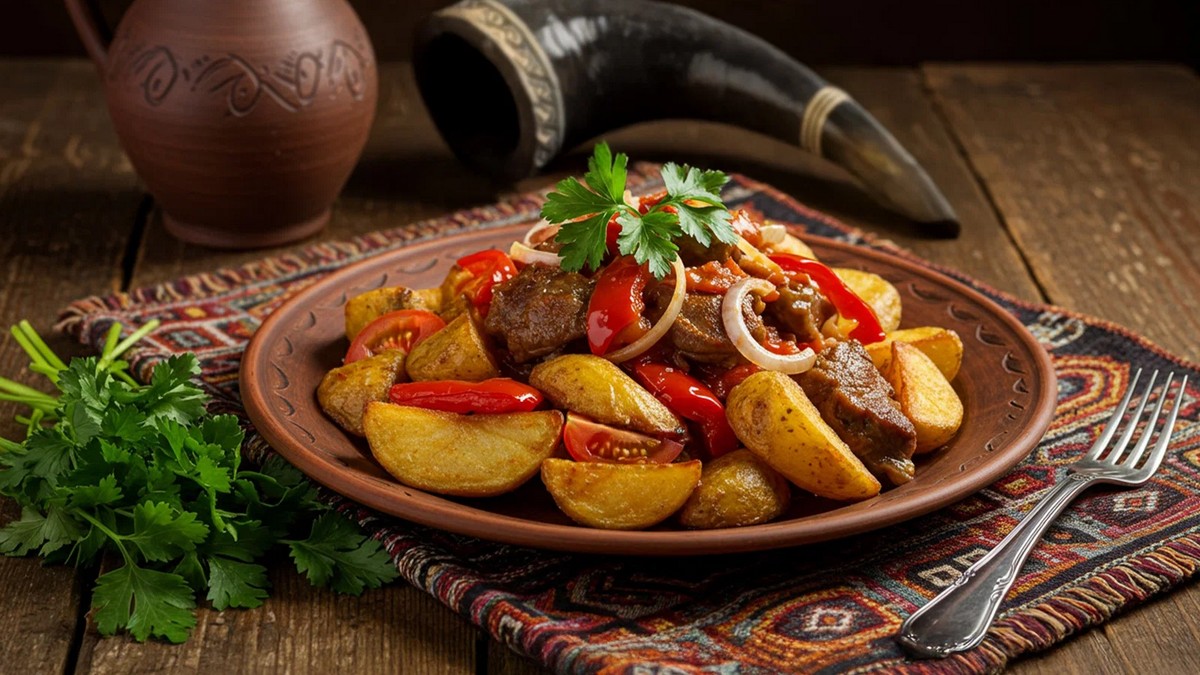 - Коли цибуля на пательні стане насичено-жовтого кольору, додайте запечену картоплю та обсмажене м’ясо. Перемішуючи, готуйте страву ще протягом 5 хвилин. Присипте отжахурі петрушкою та свіжою цибулею – і грузинську страву можна подавати до столу.