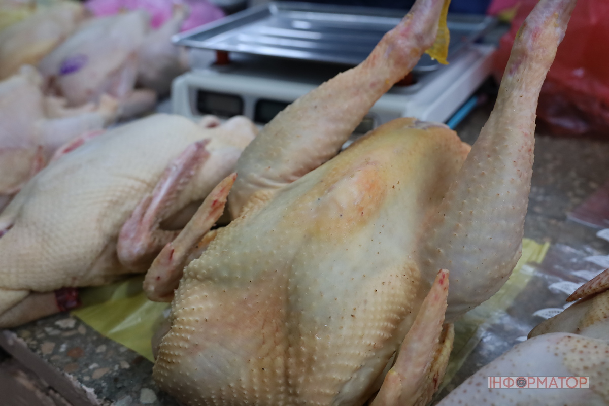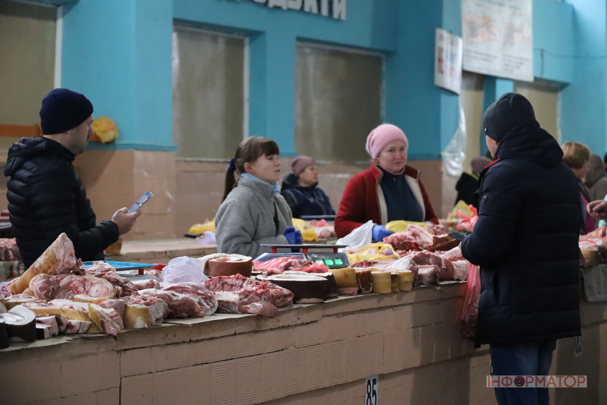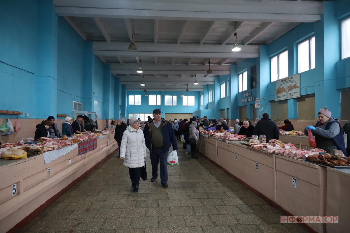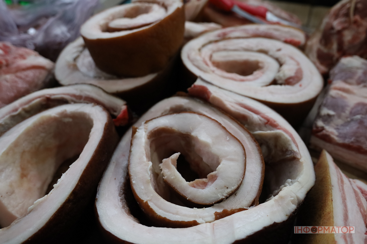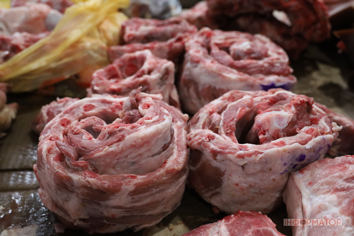 У м’ясному павільйоні одразу при одному з входів покупців зустрічала привітною посмішкою продавчиня на прилавку з курятиною. У її асортименті були цілі тушки, гомілки, супові набори та крильця. Цього дня вона також пропонувала тушку півня по 200 гривень за кілограм. Так, свинячий биток у частини торговців можна було придбати по 260 гривень за кілограм, тоді як у більшості він залишався на рівні попередніх тижнів – близько 380 гривень. Асортимент м’яса був доволі широкий. На прилавках була і свинина, і курятина. Курячого м’яса цього тижня було багато. Сало та підчеревина коштували від 350 до 400 гривень за кілограм.