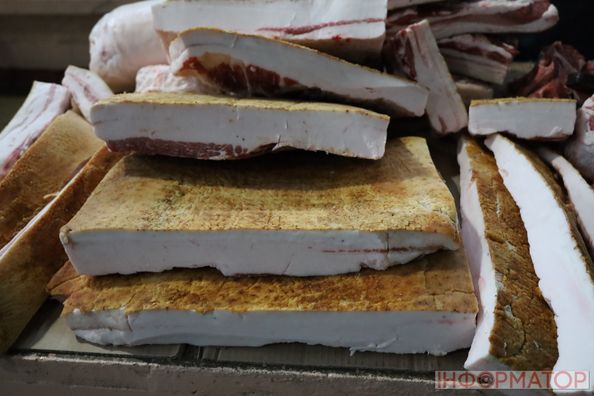 У м’ясному павільйоні були жінки, які привітно ділились цінами та пропонували свою продукцію. Дехто навіть давав скуштувати, щоби можна було оцінити на смак товар, зокрема пропонували палку ковбаски, ціна на яку становила 300 гривень. На решту продукції ціни були такими: