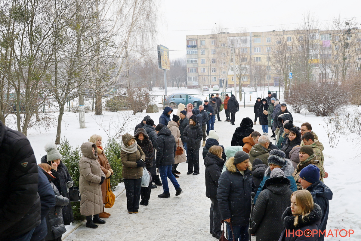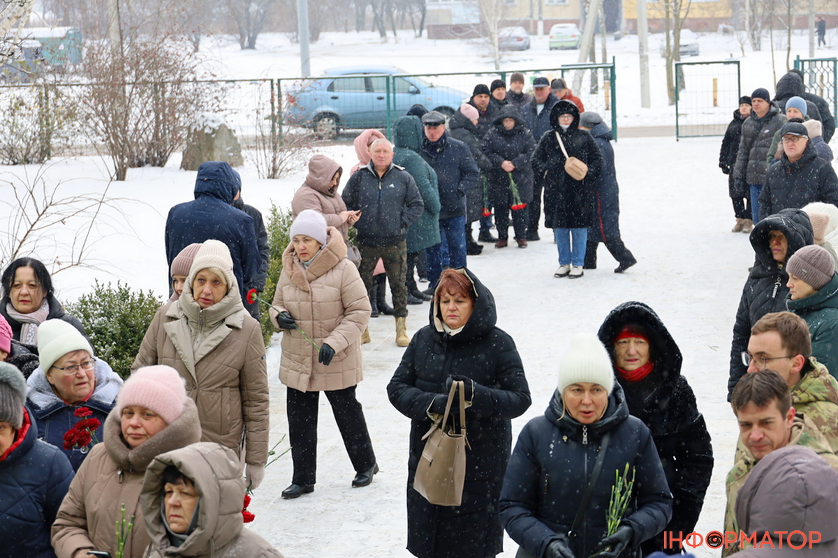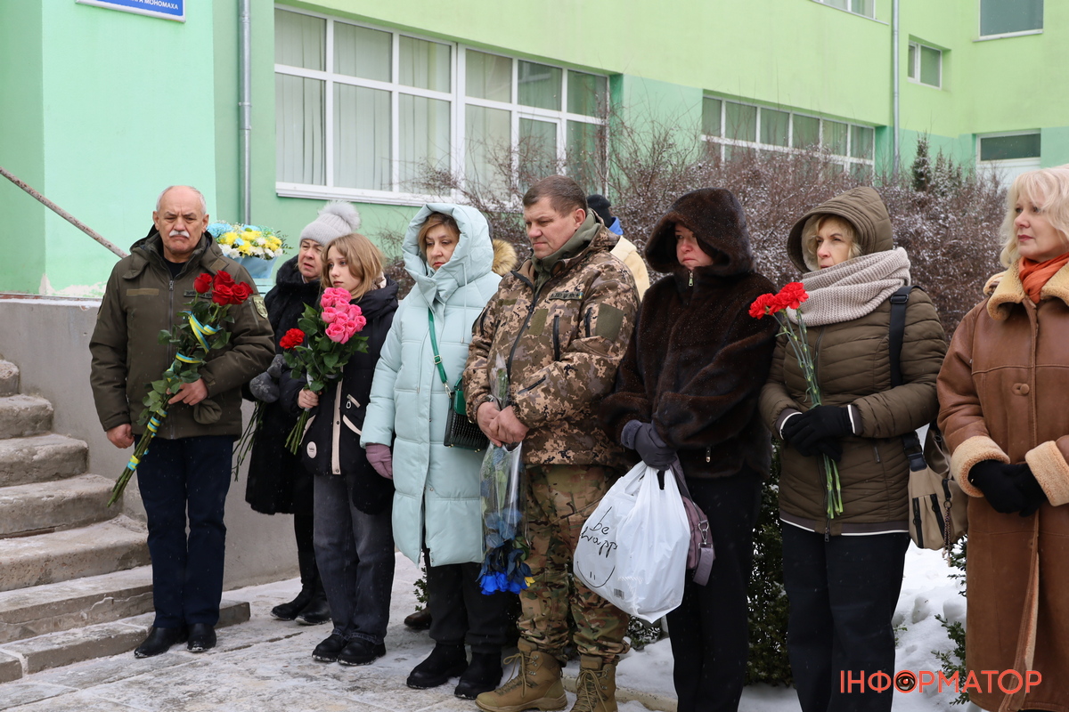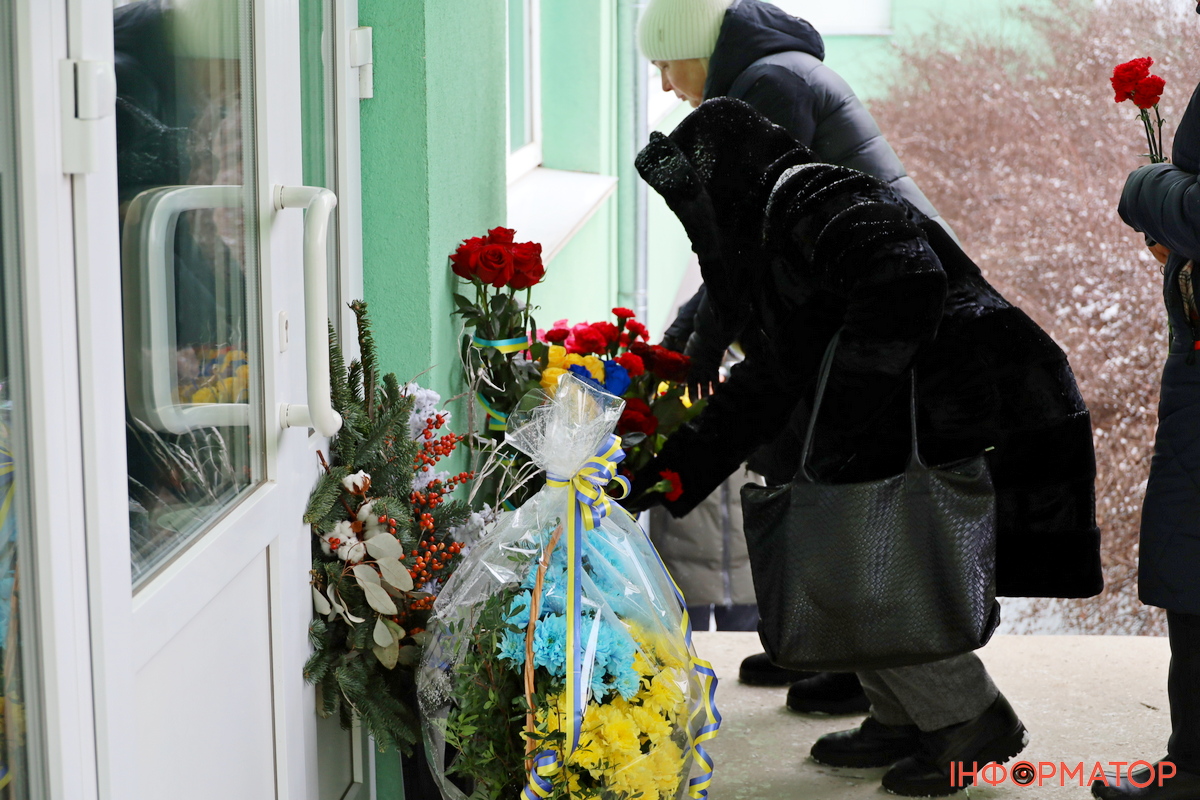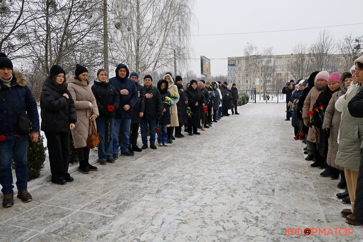 Шлях до шкільної алеї вкривав сніг, який цього ранку падав із неба безперервно. Біля вхідних воріт люди зустрічалися та обмінювалися сумними обіймами з мамою загиблого захисника Людмилою.