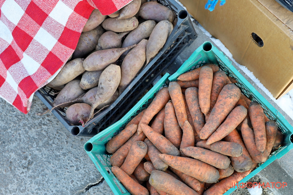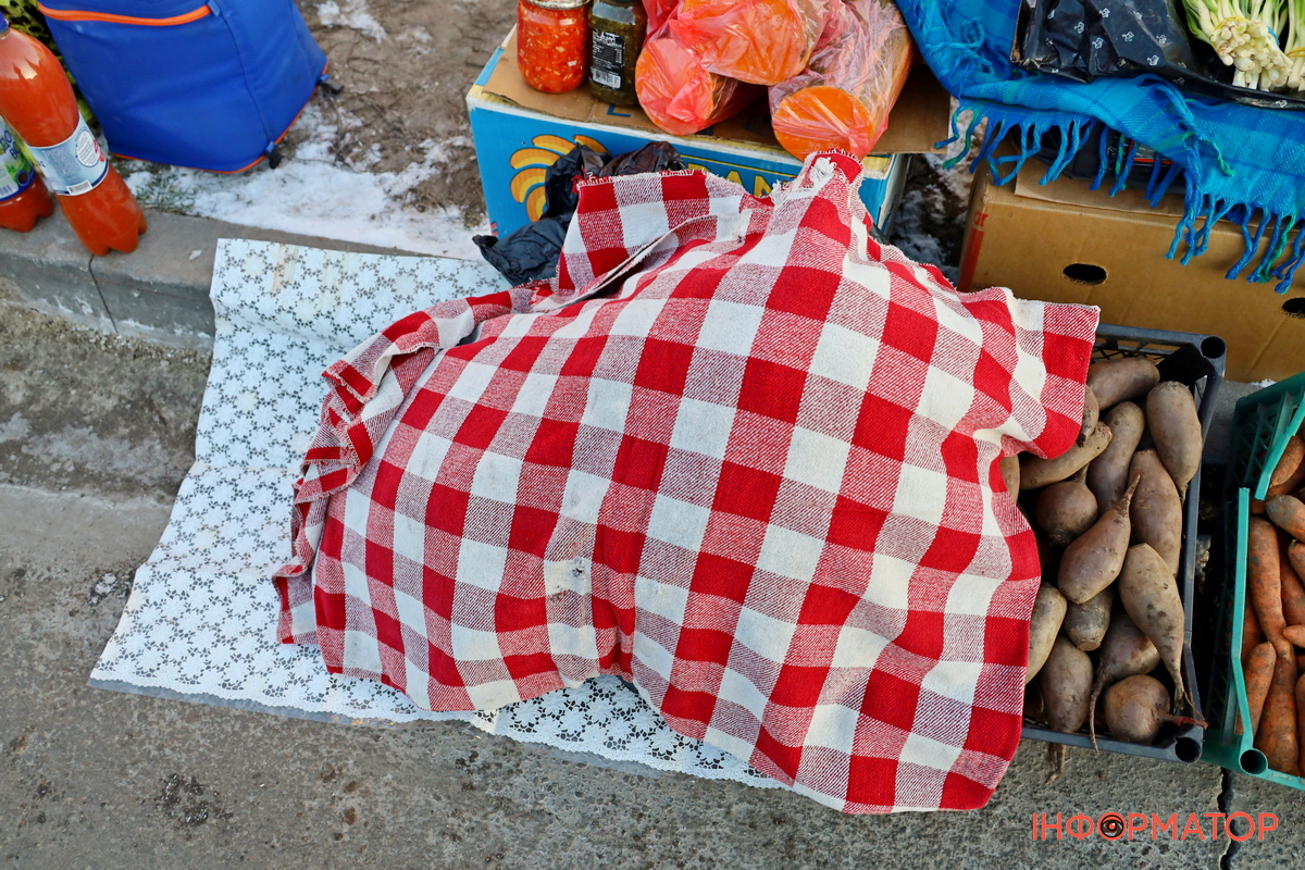 Минулого тижня на базарі зовсім не продавали овочів. Цієї неділі вибір на декількох локаціях все ж трішки був. Як розповіла одна з продавчинь – все через сильні морози. Із-за такої температури овочі можуть перемерзнути та зіпсуватися. Тож ті, хто й виставив на продаж городину, вкривали її ковдрами, або тримали у пакетах. Фрукти серед інших продуктів, так і не з’явилися. Загалом ціни на овочі зараз такі: