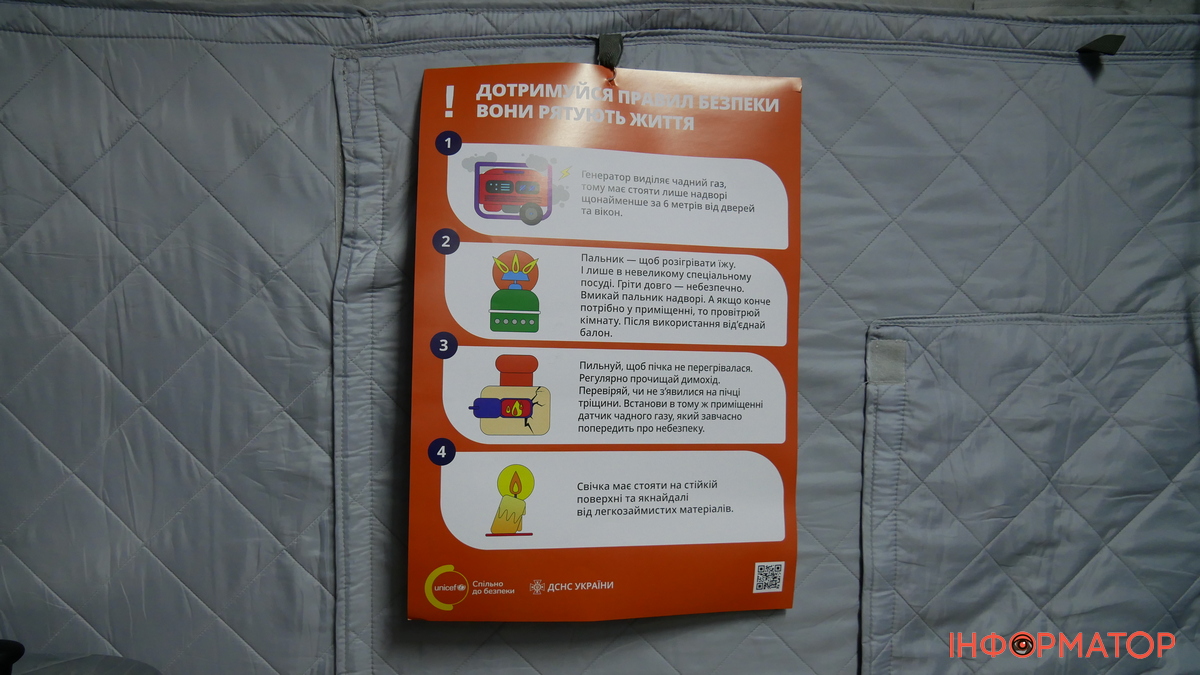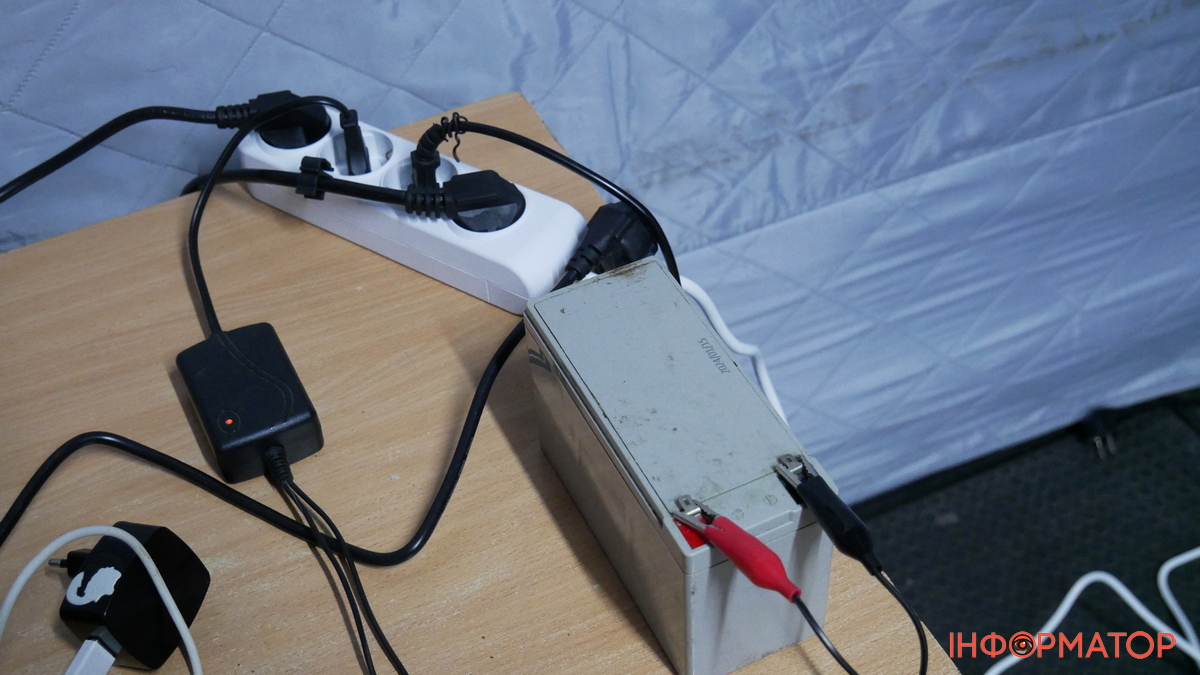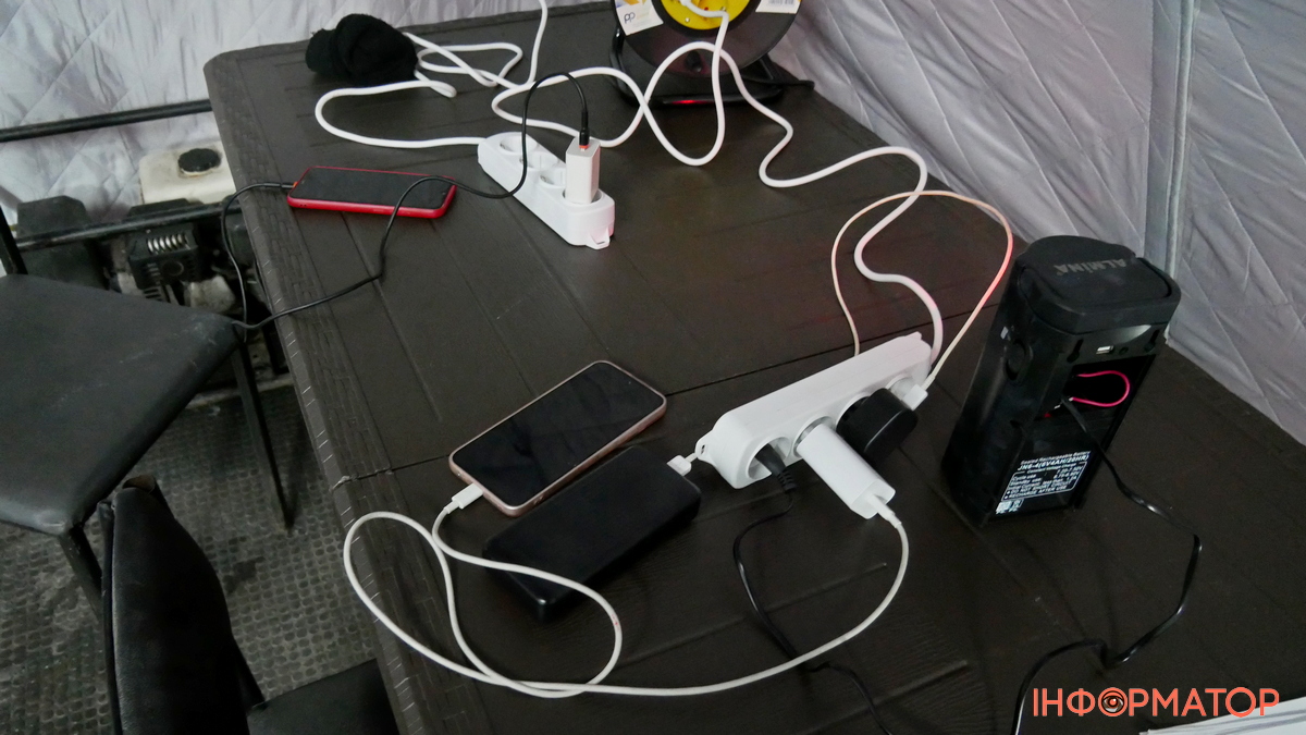 Пункт “Незламності” забезпечений генератором, обігрівачем та тепловою гарматою (пристрій для швидкого й ефективного обігріву житлових і комерційних об’єктів. Вона нагріває повітря, потім поширюючи його вентилятором, – ред). У наметі є електроенергія, тепло, вода, їжа, аптечка, мобільний зв’язок і безкоштовний Wi-Fi. Відвідувачі можуть випити чаю з печивом та відпочити.