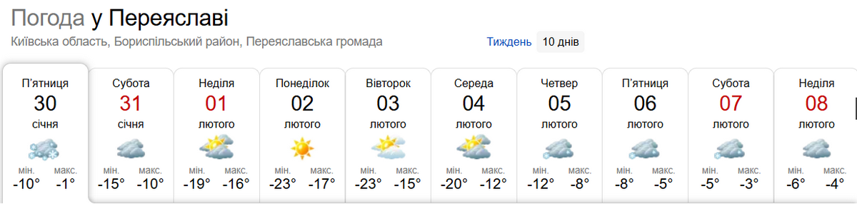 За повідомленням Українського гідрометеорологічного центру, у період з 1 по 3 лютого на території Київщини прогнозують значне зниження температури повітря: вночі від 20 до 27 градусів морозу, місцями до 30 градусів нижче нуля (ІІІ рівень небезпечності, червоний), вдень від 15 до 22 градусів з позначкою мінус. Послаблення морозів очікується 4-5 лютого.