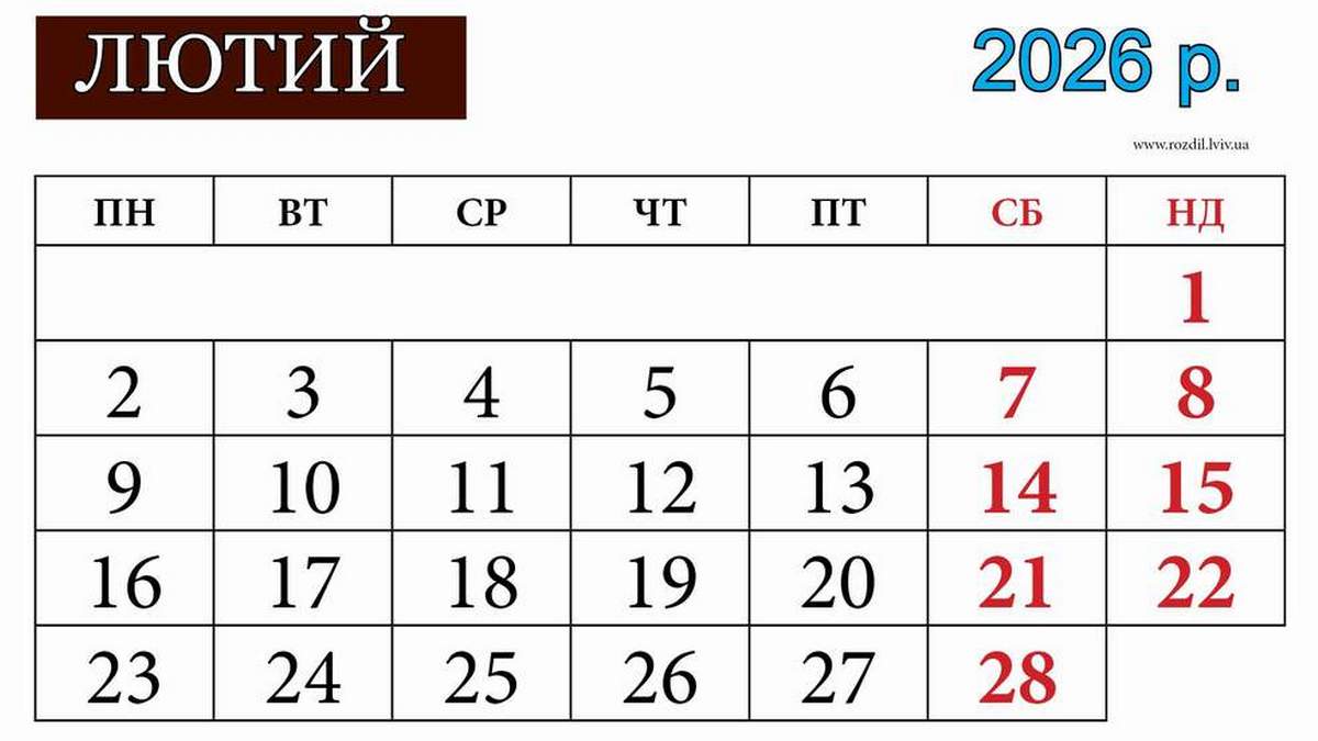 У лютому українці відпочиватимуть лише по суботах та неділях, адже додаткових вихідних під час воєнного стану не надають, навіть якщо святковий день збігається із суботою чи неділею. Вихідні лютого 2026 року – 1, 7, 8, 14, 15, 21, 22 та 28 числа. Про це повідомляє Інформатор.