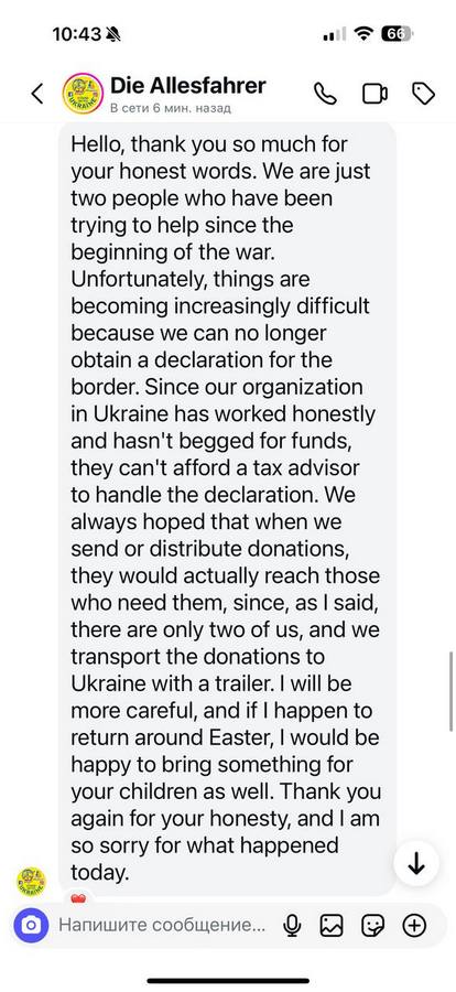 “Привіт, щиро дякую за ваші чесні слова. Ми – лише двоє людей, які із самого початку війни намагаються допомагати. На жаль, ситуація стає дедалі складнішою, оскільки ми більше не можемо отримати декларацію для перетину кордону. Оскільки наша організація в Україні працювала чесно і не випрошувала кошти, вона не може дозволити собі податкового консультанта для оформлення цієї декларації. Ми завжди сподівалися, що коли надсилаємо або розподіляємо пожертви, вони справді доходять до тих, хто їх потребує, адже, як я вже казав(ла), нас лише двоє, і ми перевозимо допомогу в Україну причепом (трейлером). Я буду більш уважним(ою), і якщо мені вдасться повернутися приблизно на Великдень, я з радістю привезу щось і для ваших дітей. Ще раз дякую за вашу чесність і мені дуже шкода через те, що сталося сьогодні”.